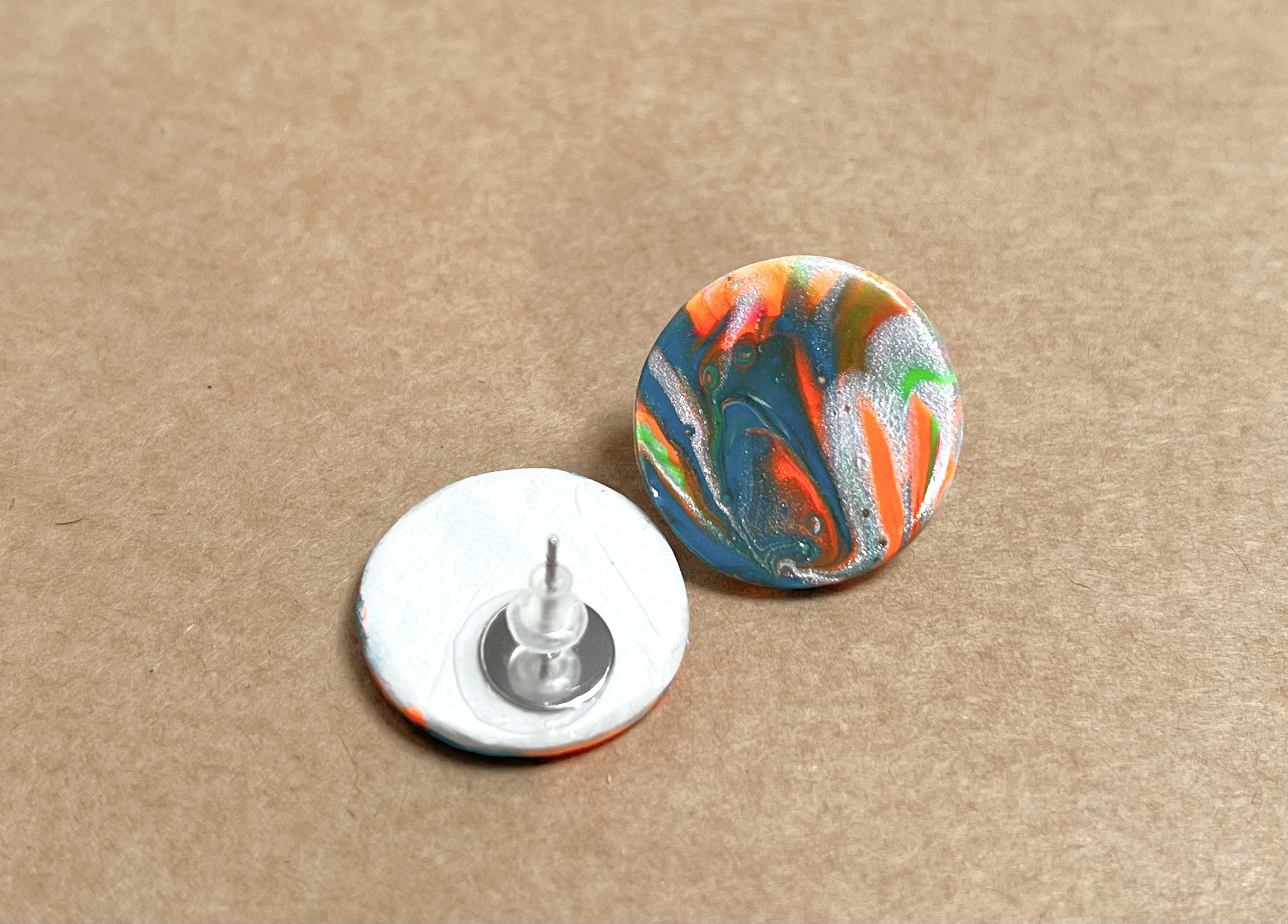Cercei realizati din lut si vopsea. Prinderea se face cu tija din inox si dop de silicon. Diametru 2 cm. Modelul este unicat si nu se poate reproduce.