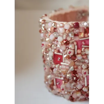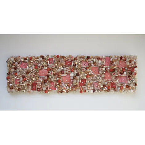 Cordeluta realizata din margele de sticla, plasa si vopsea acrilica cusute pe fetru roz. Baza cordelutei este imbracata in fetru.