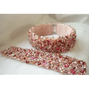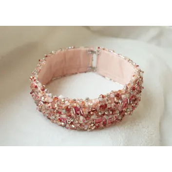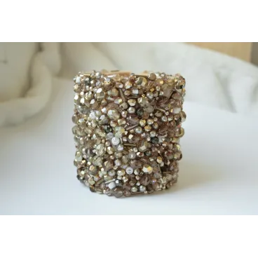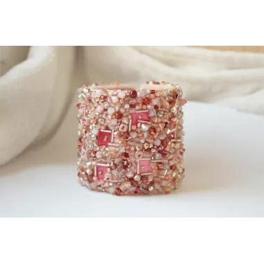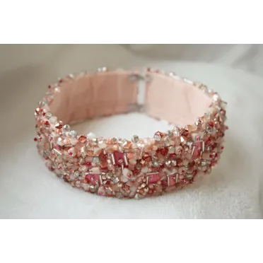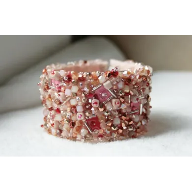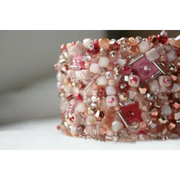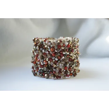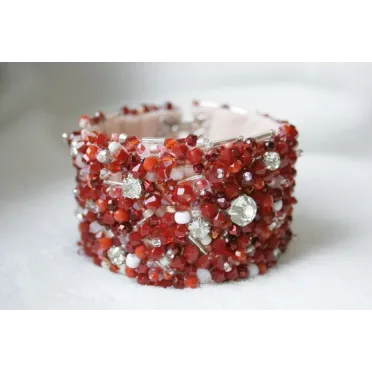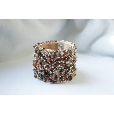 Bratara realizata din margele de sticla, perle Swarovski si margele de sticla Cehia firepolish cusute pe fetru. Prinderea se face cu inchizatori "mos si baba". Latime: 4,8 cm Lungime: 18 cm