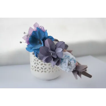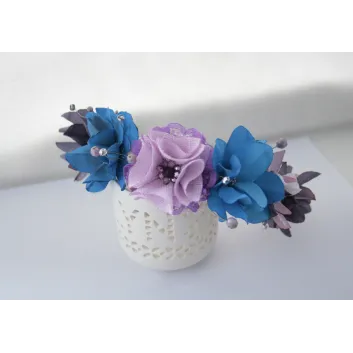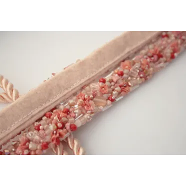Cordeluta este realizata din flori din material textil, margele de sticla, margele din jad, margele din spuma si margele cehia aplicate pe o baza de cordeluta din plastic. Florile din material textil sunt realizate manual. Produsul este unicat. Latime: 5,5 cm