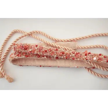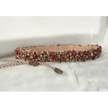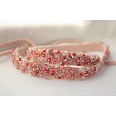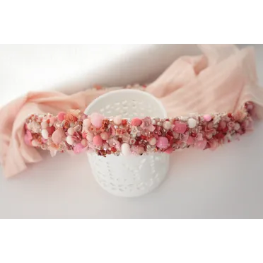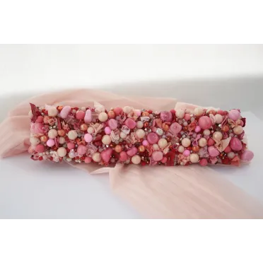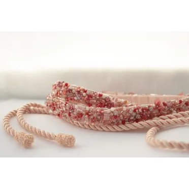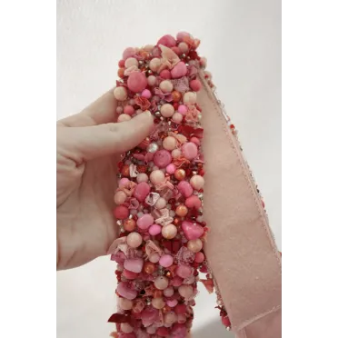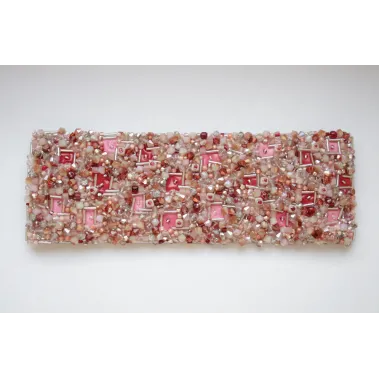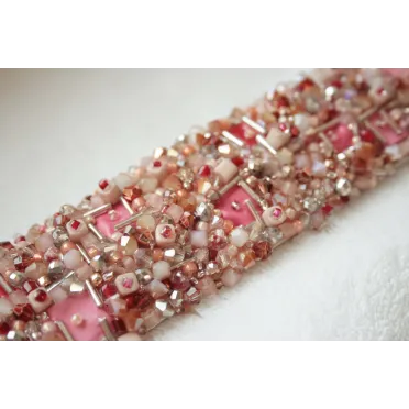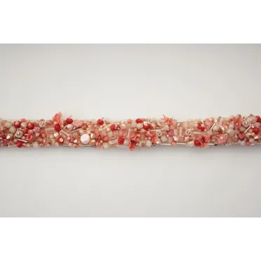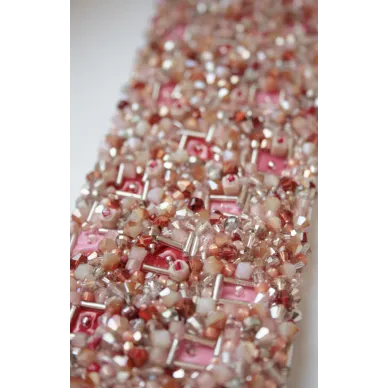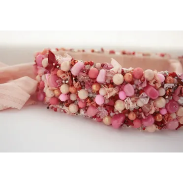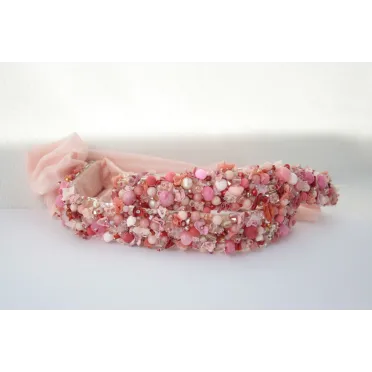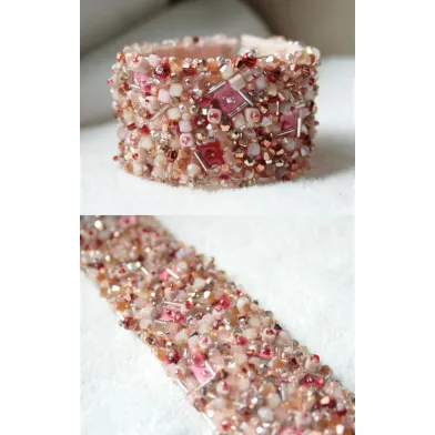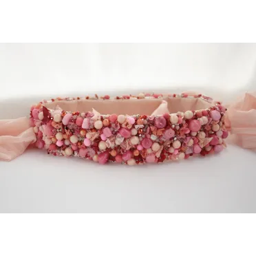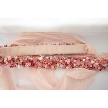 Brau realizat din margele de jad, margele de sticla, cristale, vopsea acrilica, margele de spuma, tulle si plasa cusute pe fetru. Braul se leaga la spate cu un cordon din plasa de culoare piersic-rose. Latime broderie cu margele: 3 cm Lungime broderie cu margele: 65 cm Lungime totala: 185 cm