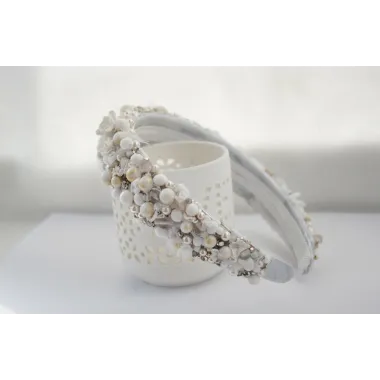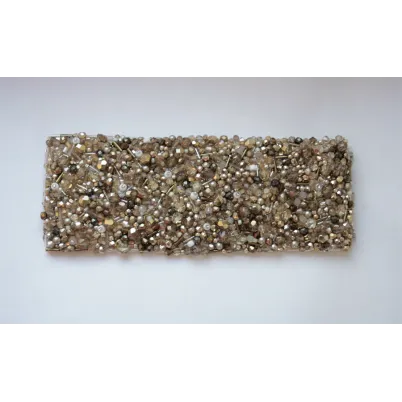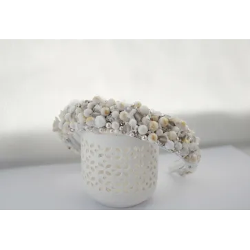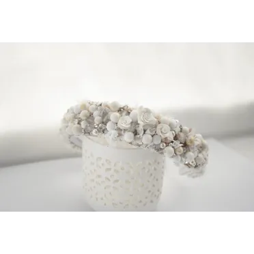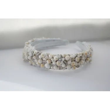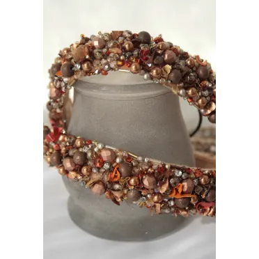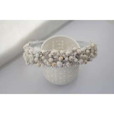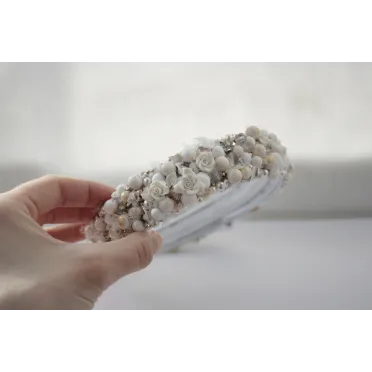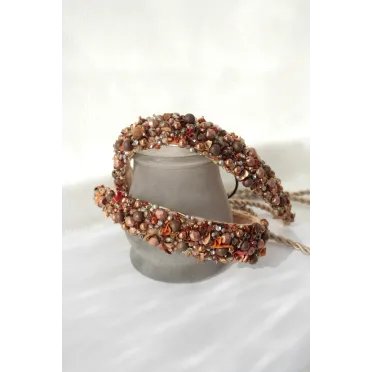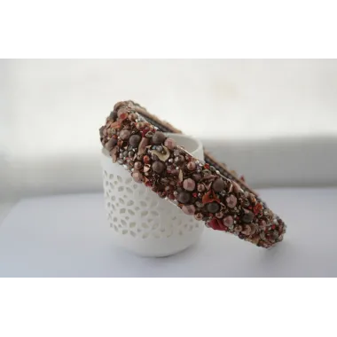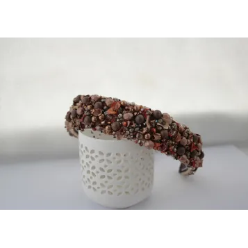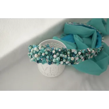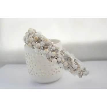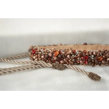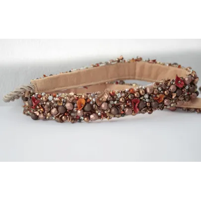 Brau realizat manual cu perle Swarovski, margele de sticla, margele Cehia, cristale, margele din piatra vulcanica, vopsea acrilica si tulle cusute pe fetru. Se leaga la spate cu un snur. Lungime broderie cu margele: 71 cm Latime broderie cu margele: 2 cm Lungime totala: 149 cm
