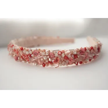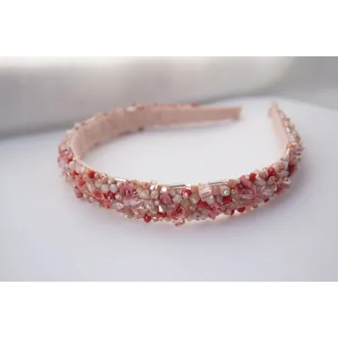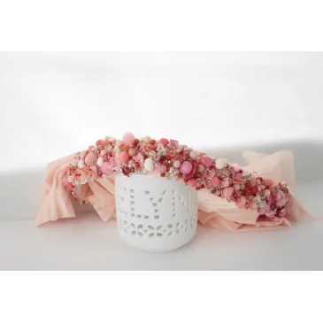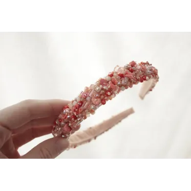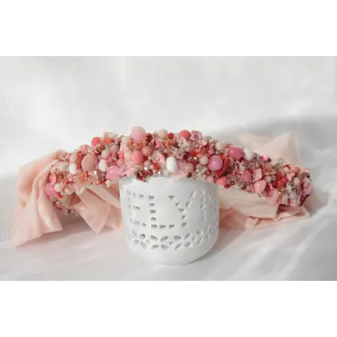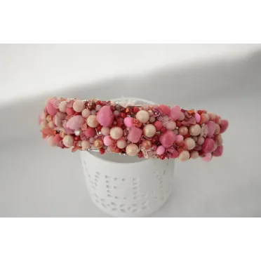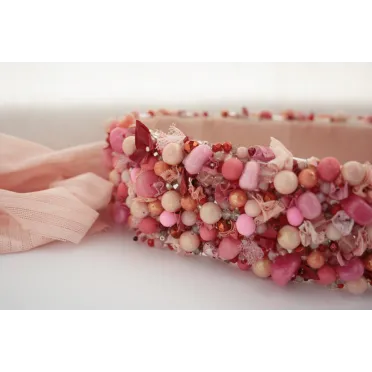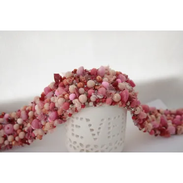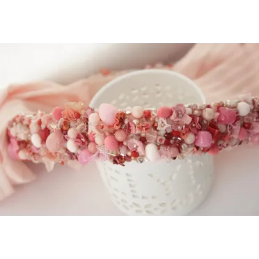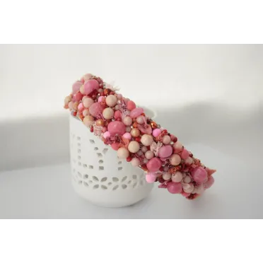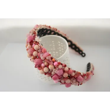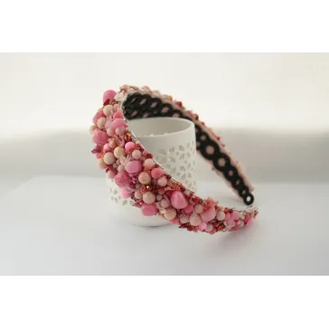 Cordeluta realizata manual din jad roz, margele de sticla, margele din spuma, vopsea acrilica, tulle, plasa, cusute pe fetru roz si aplicate pe o baza de cordeluta din plastc.