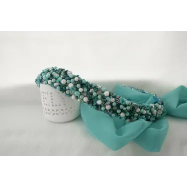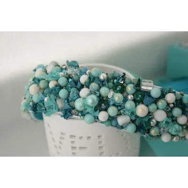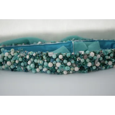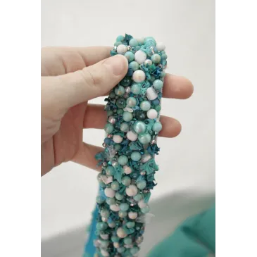 Brau realizat din margele de jad, perle Swarovski, margele de sticla, perle de cultura, vopsea acrilica, tulle si organza cusute pe fetru si panglica albastra de satin. Braul se leaga la spate cu un cordon din organza. Lungime broderie cu margele: 59 cm Latime broderie cu margele: 3,5 cm Lungime totala: 217 cm