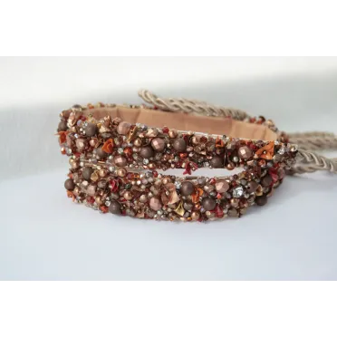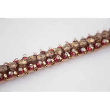 Brau realizat din perle Swarovski, margele de sticla, margele Cehia, vopsea acrilica si cristale cusute pe fetru. Se leaga la spate cu un snur. Latimea broderiei cu margele variaza, la capete avand 2 cm iar in centru 3 cm. Lungime broderie cu margele: 66 cm Lungime totala: 185 cm