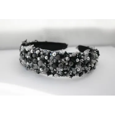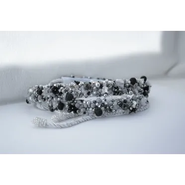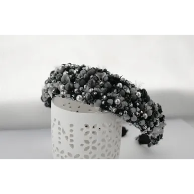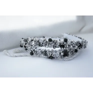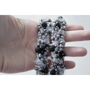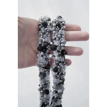 Cordeluta realizata manual din perle Swarovski, margele de sticla, margele Cehia, margele din spuma, vopsea acrilica, tulle gri si negru, cusute pe fetru gri si aplicate pe o baza imbracata in catifea neagra.