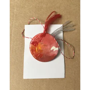 Martisor rotund, realizat din lut si vopsea acrilica. Martisorul este lacuit cu vernis. Prinderea se face cu ac de brosa din inox. Diametru: 3,3 cm. Modelul este unicat si nu se poate reproduce. A se depozita intr-un loc inchis, ferit de razele directe ale soarelui, departe de obiecte grele sau ascutite care ar putea deteriora martisorul.