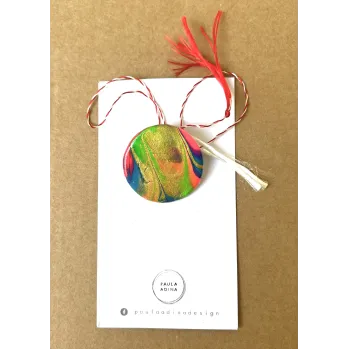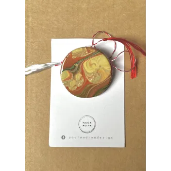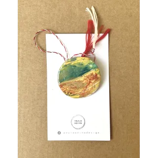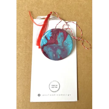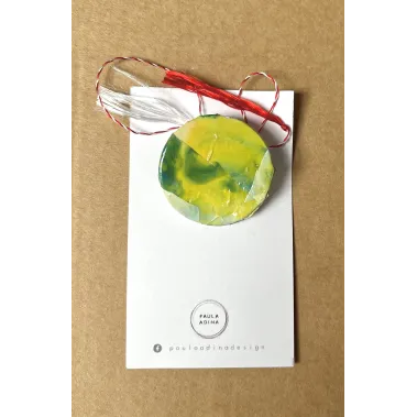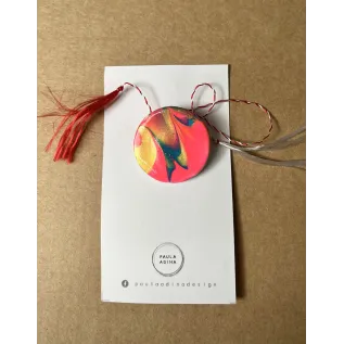 Martisor rotund, realizat din lut si vopsea acrilica. Martisorul este lacuit cu vernis. Prinderea se face cu ac de brosa. Diametru: 2,7 cm. Modelul este unicat si nu se poate reproduce. A se depozita intr-un loc inchis, ferit de razele directe ale soarelui, departe de obiecte grele sau ascutite care ar putea deteriora martisorul.