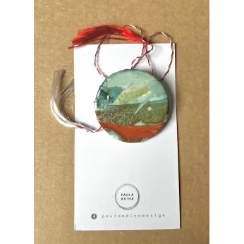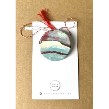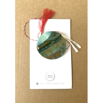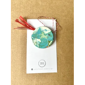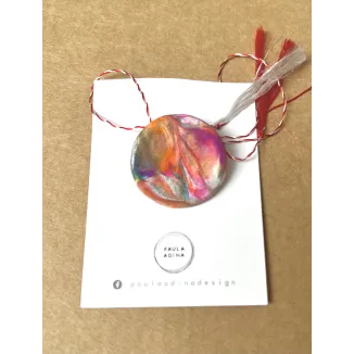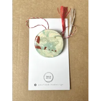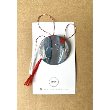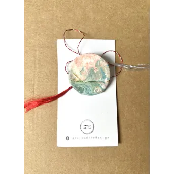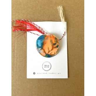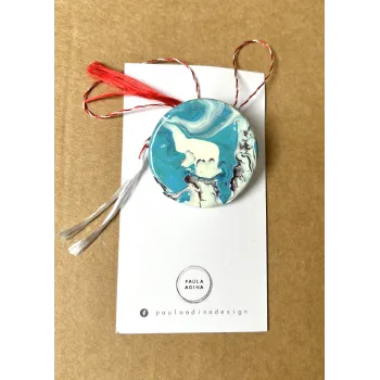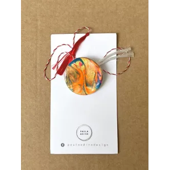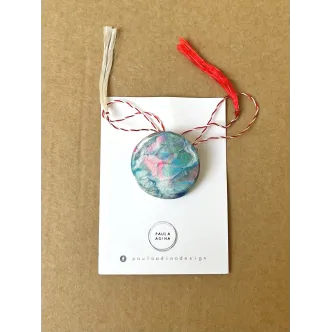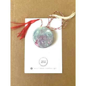 Martisor rotund, realizat din lut si vopsea acrilica. Martisorul este lacuit cu vernis. Prinderea se face cu ac de brosa din inox. Diametru: 2,7 cm. Modelul este unicat si nu se poate reproduce. A se depozita intr-un loc inchis, ferit de razele directe ale soarelui, departe de obiecte grele sau ascutite care ar putea deteriora martisorul.
