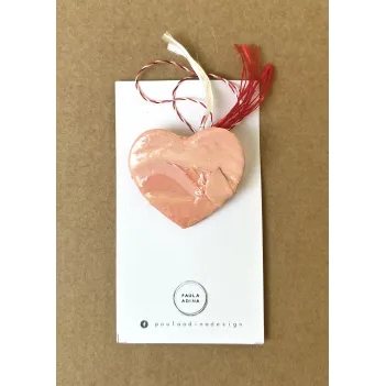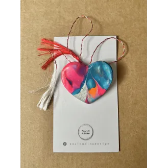 Martisor in forma de inima realizat din lut si vopsea. Martisorul este lacuit cu vernis. Prinderea se face cu ac de brosa din inox. Dimensiune: 3,4 x 3,7 cm. Modelul este unicat si nu se poate reproduce. A se depozita intr-un loc inchis, ferit de razele directe ale soarelui, departe de obiecte grele sau ascutite care ar putea deteriora martisorul.