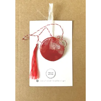 Martisor rotund, realizat din lut si vopsea. Martisorul este lacuit cu vernis. Prinderea se face cu ac de brosa din inox. Diametru: 2,7 cm. Modelul este unicat si nu se poate reproduce. A se depozita intr-un loc inchis, ferit de razele directe ale soarelui, departe de obiecte grele sau ascutite care ar putea deteriora martisorul.