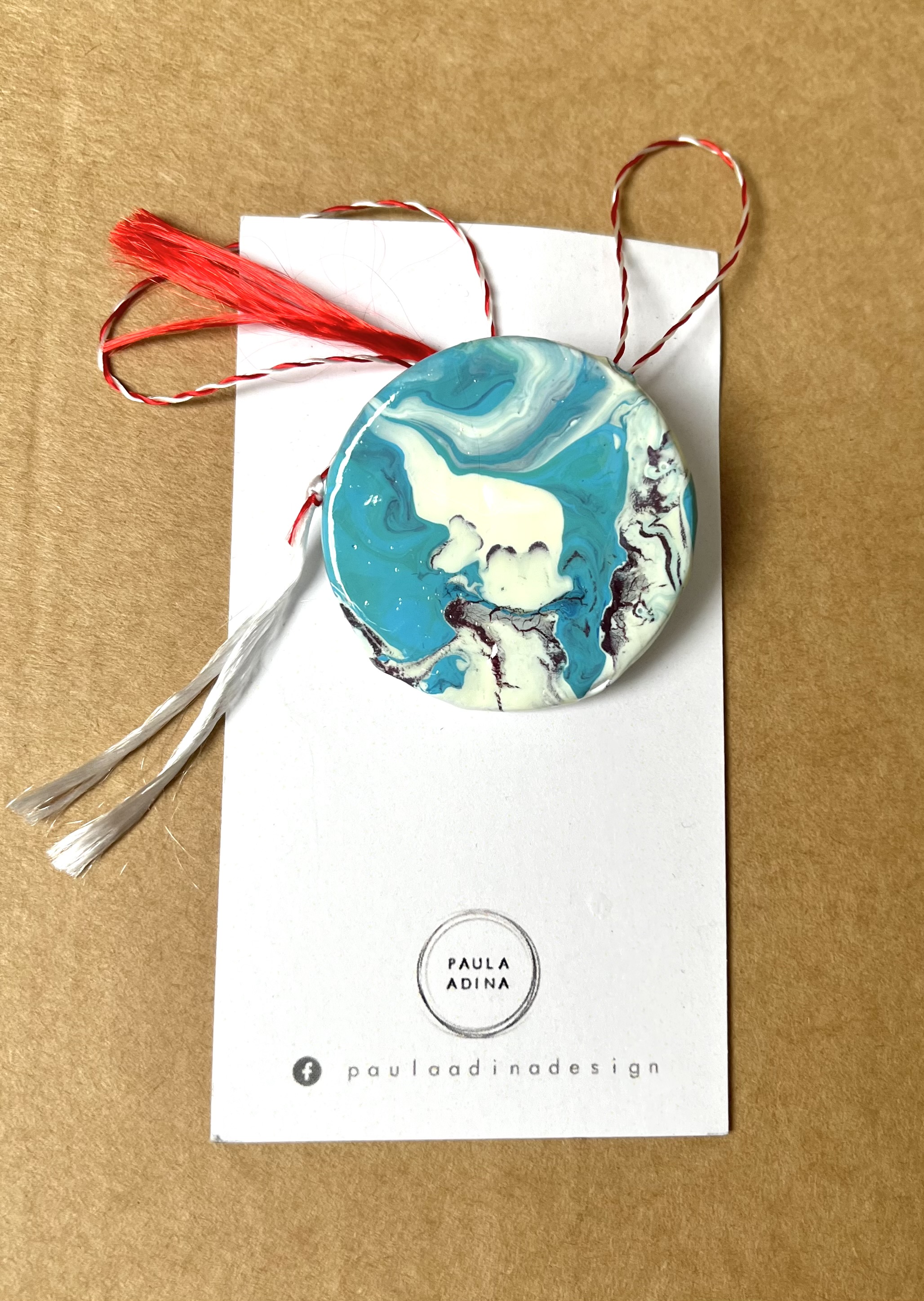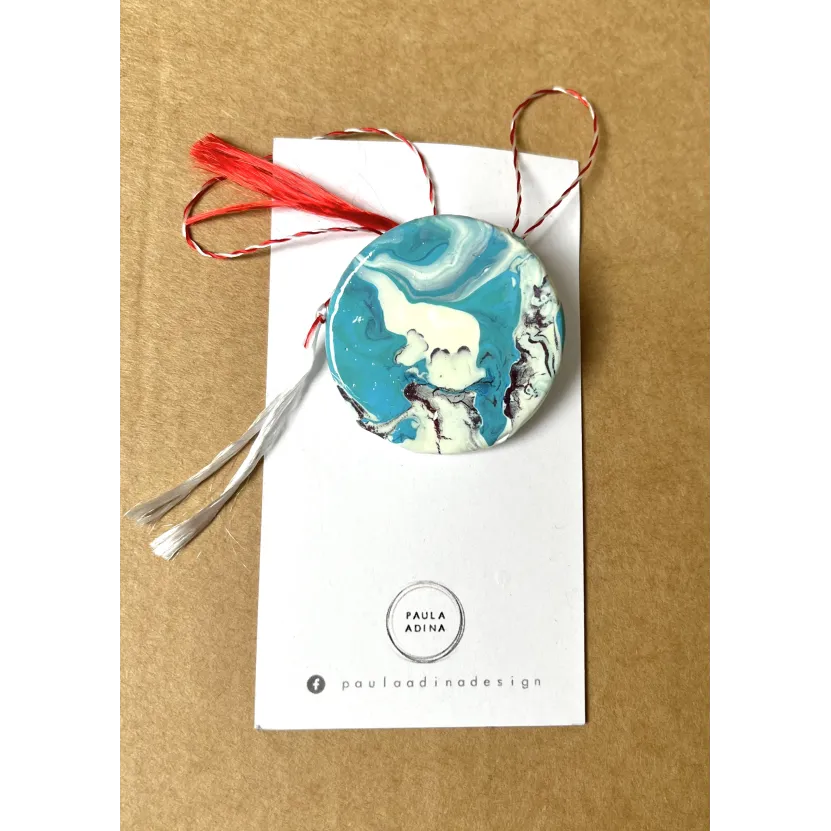 Martisor rotund, realizat din lut si vopsea acrilica. Martisorul este lacuit cu vernis. Prinderea se face cu ac de brosa din inox. Diametru: 3,3 cm.