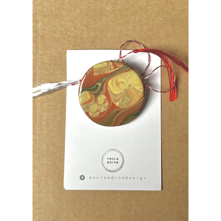 Martisor rotund, realizat din lut si vopsea acrilica. Martisorul este lacuit cu vernis. Prinderea se face cu ac de brosa. Diametru: 3,3 cm.