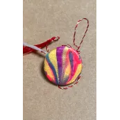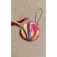 Martisor rotund, realizat din lut si vopsea. Martisorul este lacuit cu vernis. Prinderea se face cu ac de brosa din inox. Diametru: 2,7 cm.