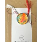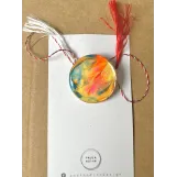 Martisor rotund, realizat din lut si vopsea. Martisorul este lacuit cu vernis. Prinderea se face cu ac de brosa din inox. Diametru: 2,7 cm.
