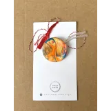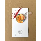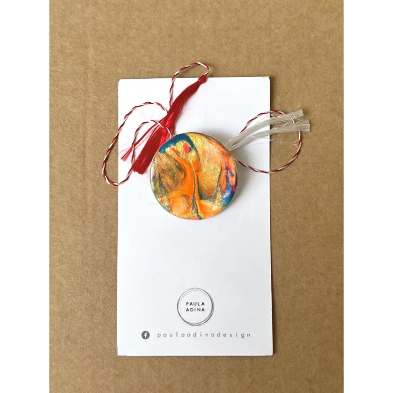 Martisor rotund, realizat din lut si vopsea. Martisorul este lacuit cu vernis. Prinderea se face cu ac de brosa din inox. Diametru: 2,7 cm.
