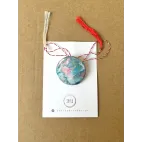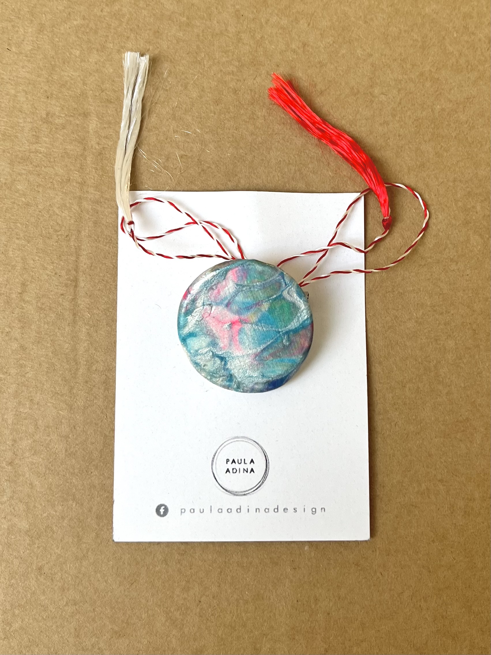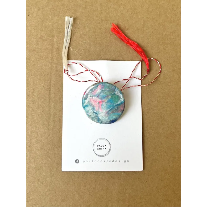 Martisor rotund, realizat din lut si vopsea. Martisorul este lacuit cu vernis. Prinderea se face cu ac de brosa din inox. Diametru: 2,7 cm.