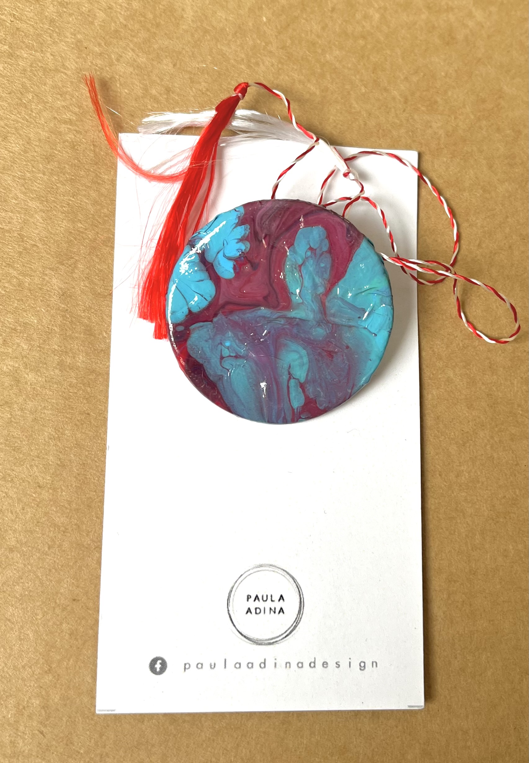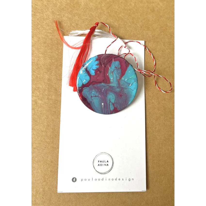 Martisor rotund, realizat din lut si vopsea acrilica. Martisorul este lacuit cu vernis. Prinderea se face cu ac de brosa. Diametru: 3,3 cm.