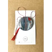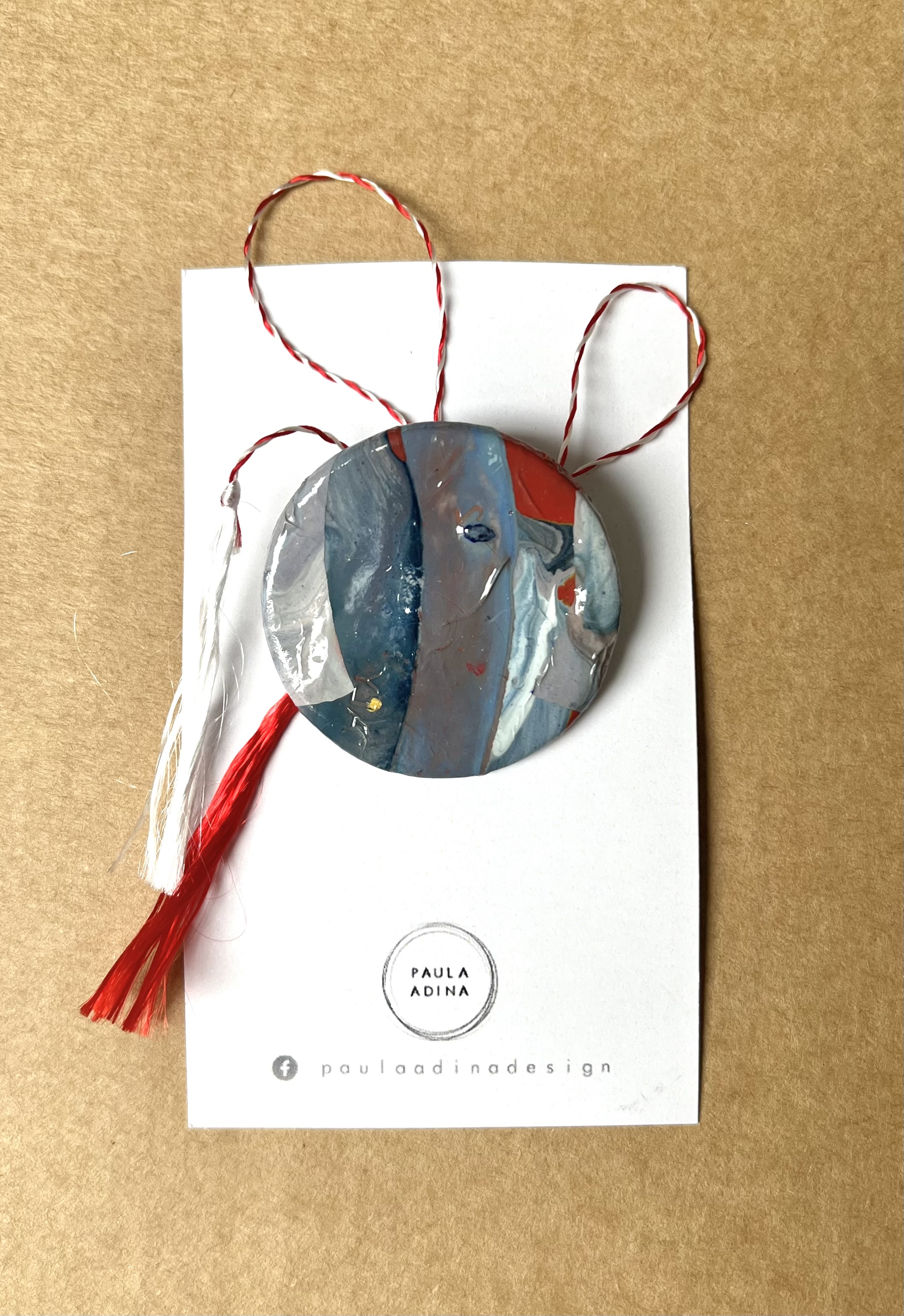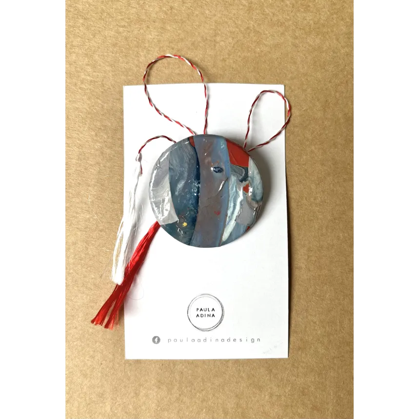 Martisor rotund, realizat din lut si vopsea acrilica. Martisorul este lacuit cu vernis. Prinderea se face cu ac de brosa din inox. Diametru: 3,3 cm.