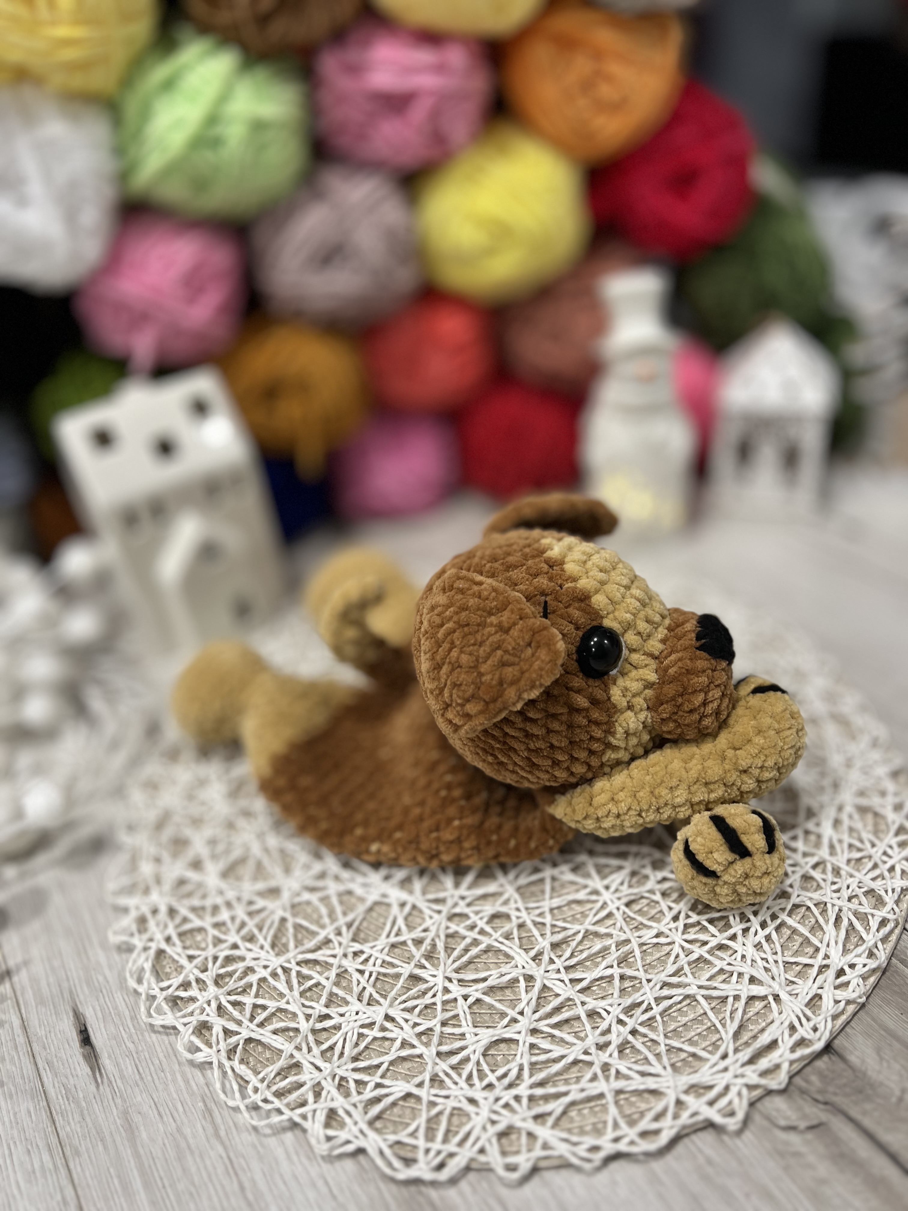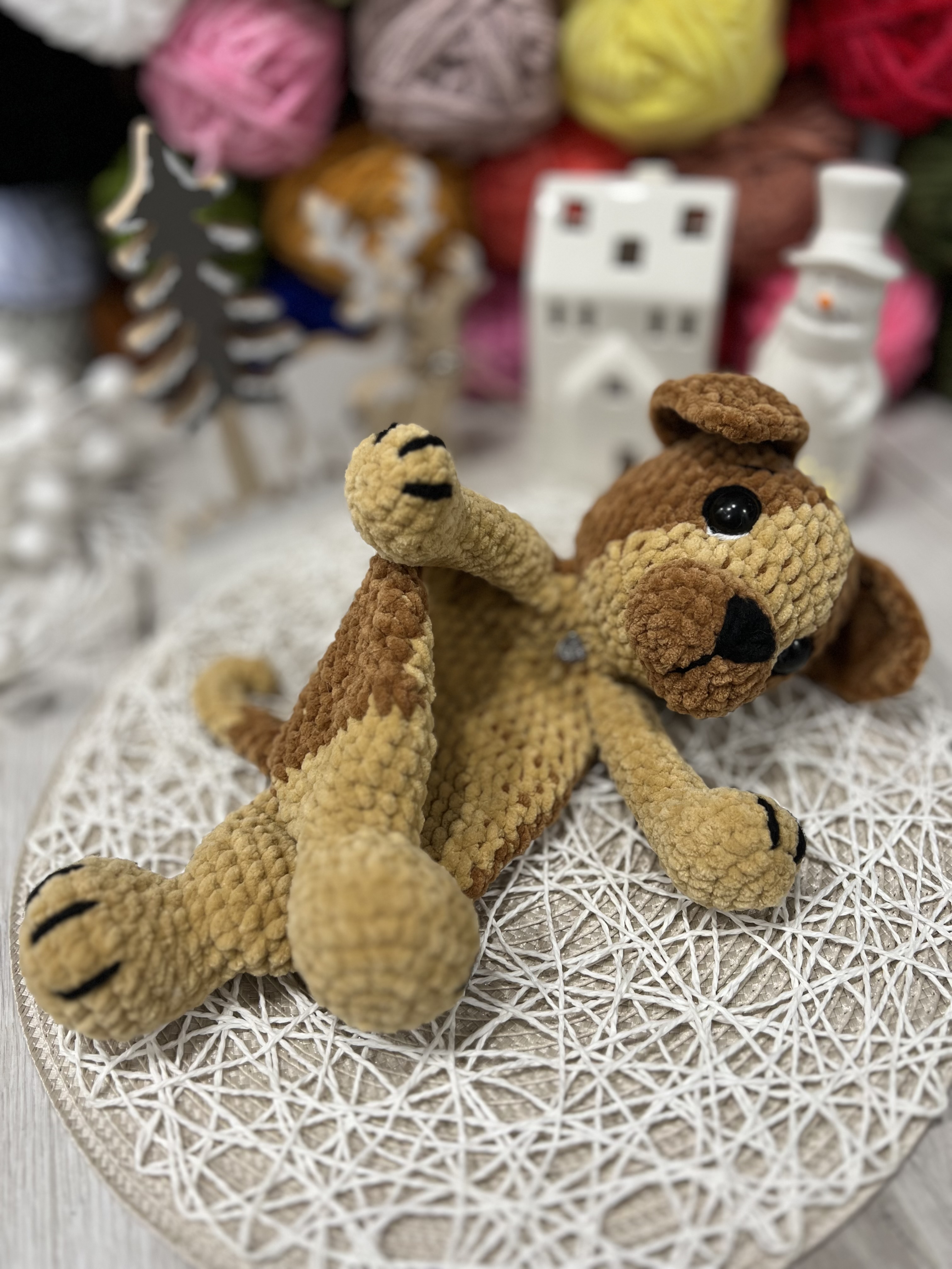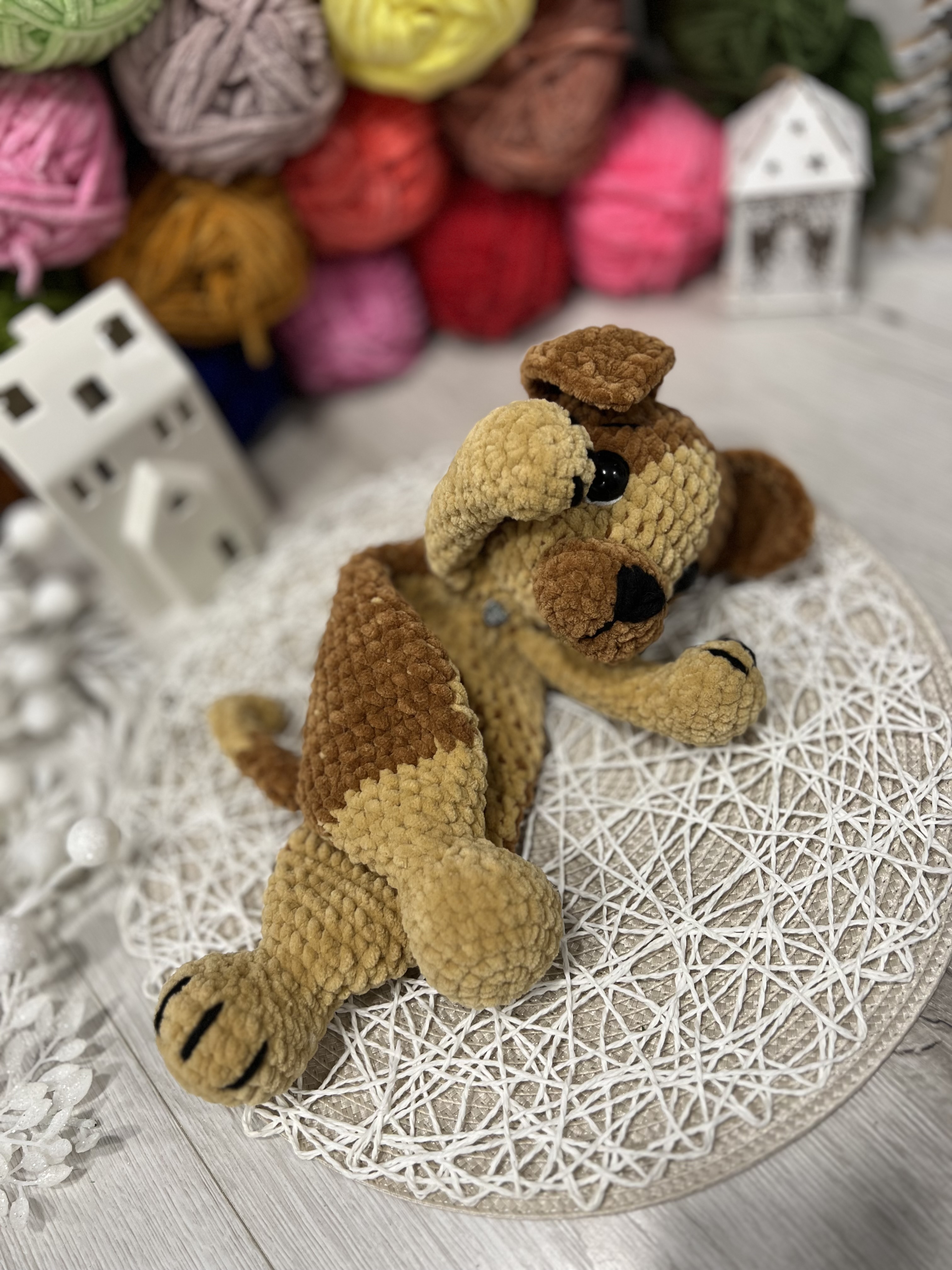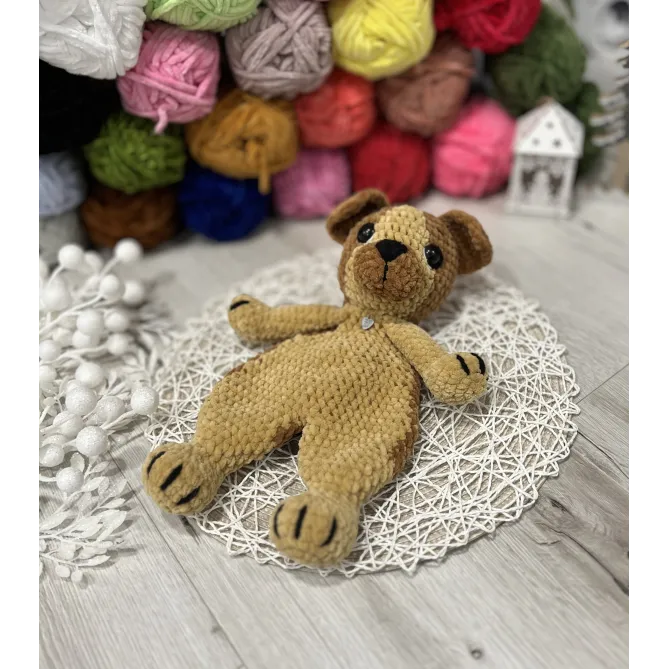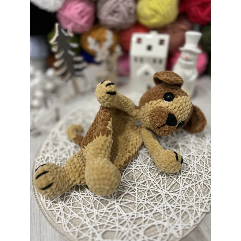 Jucarie de atasament ptr manute mici. Catel crosetat cu corp ,o jucarie handmade, realizata din fire moi de catifea , umpluta cu material hipoalergenic. Are un design adorabil, cu detalii cusute manual, ochi cu siguranta . Este o jucarie sigura pentru copii, placuta la atingere si ideala pentru imbratisari sau joaca. Perfecta pentru bebelusul tau sau pentru un cadou special !