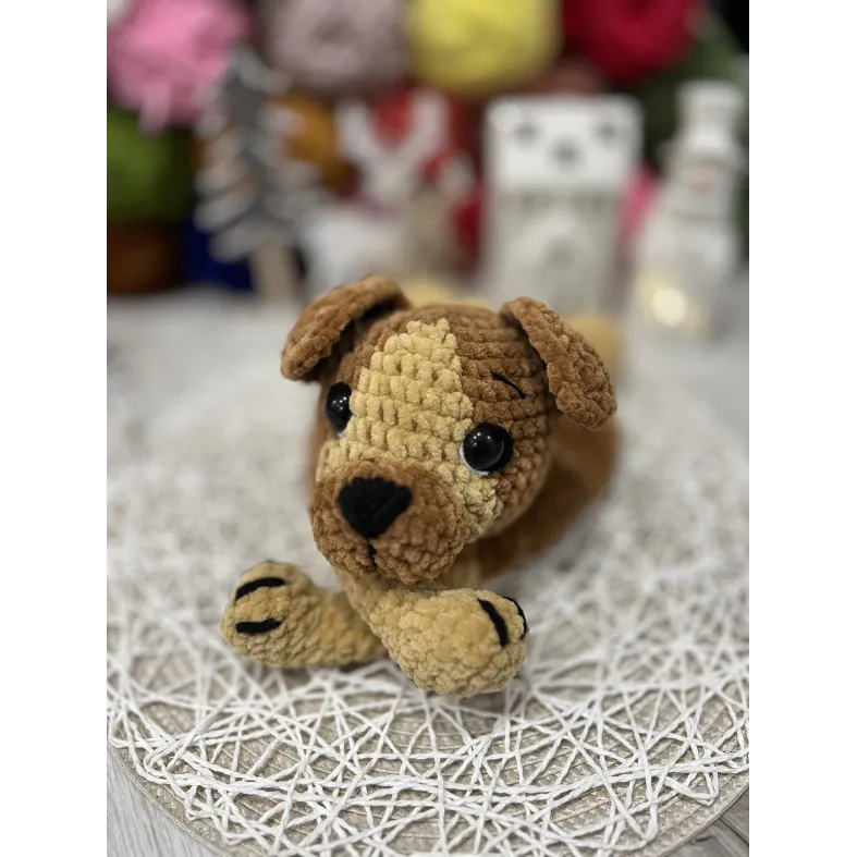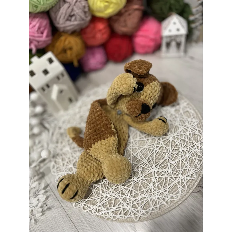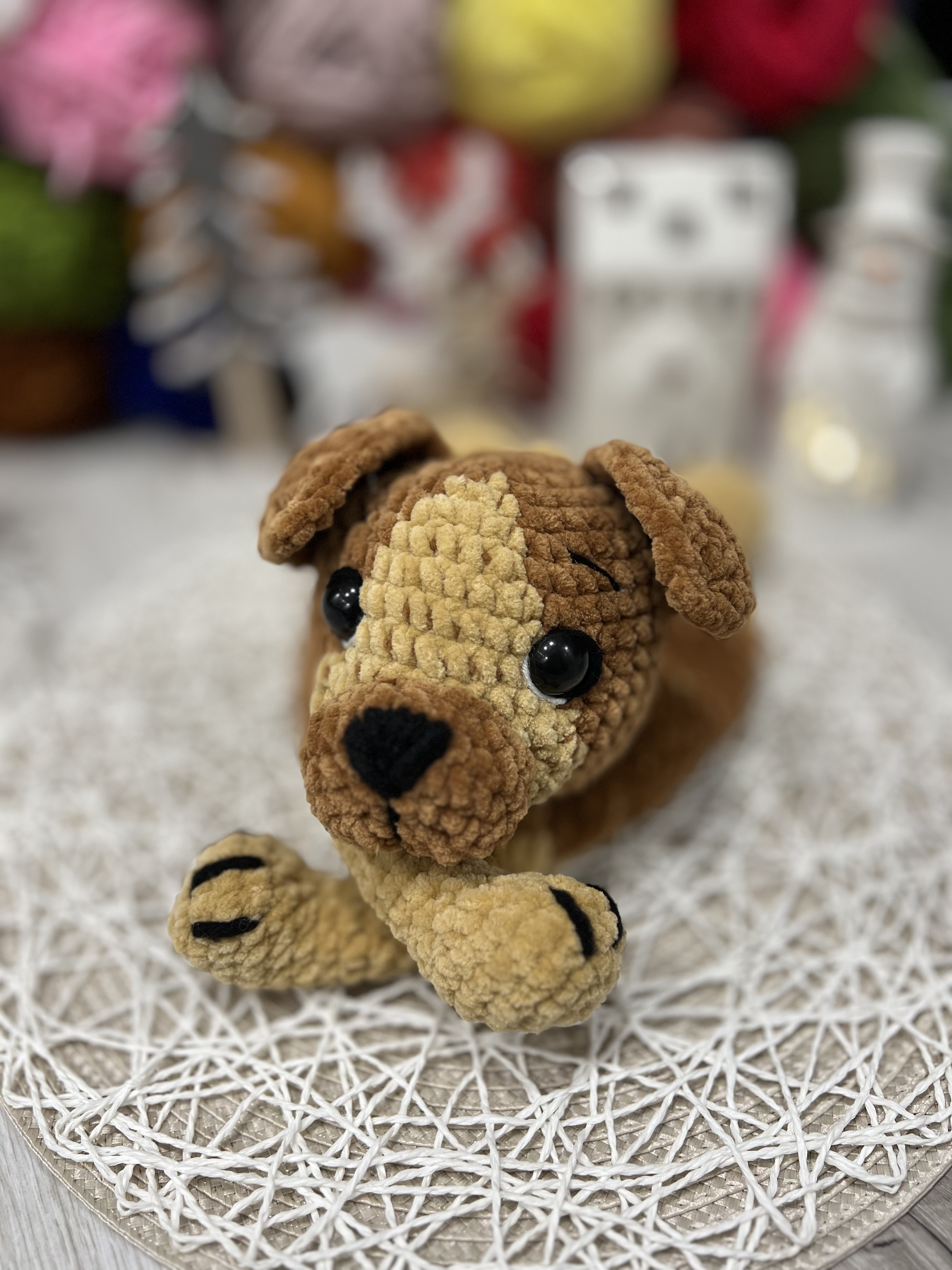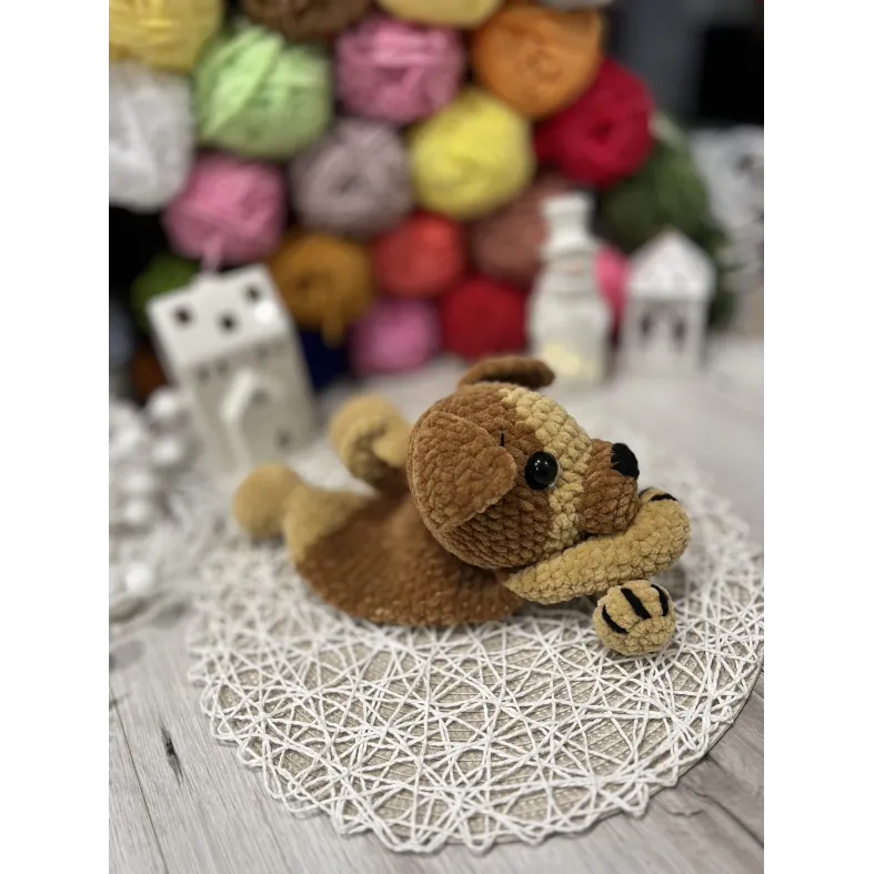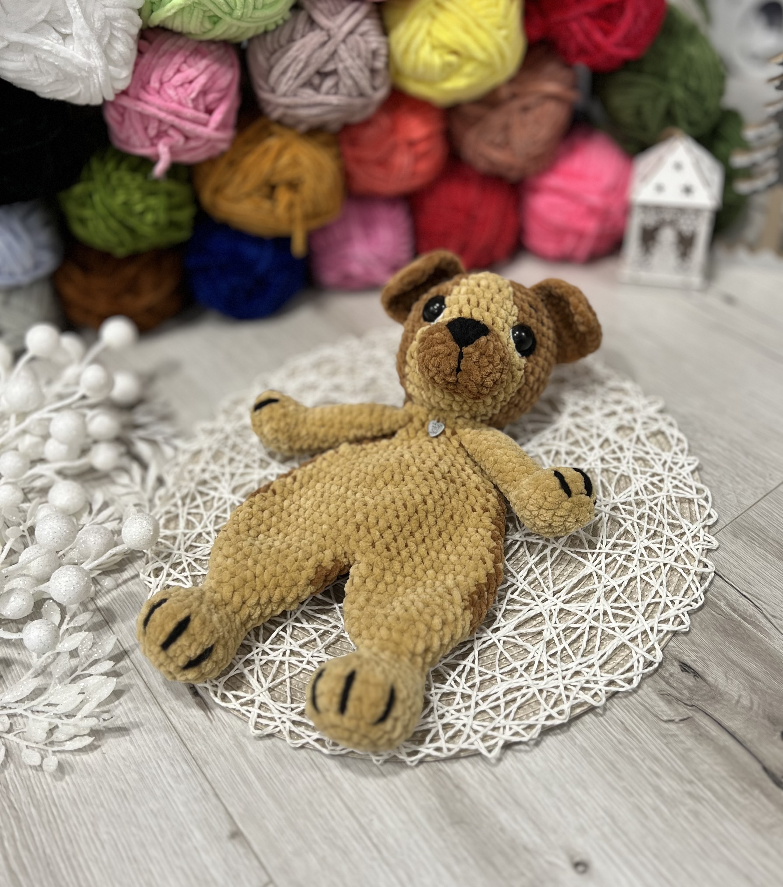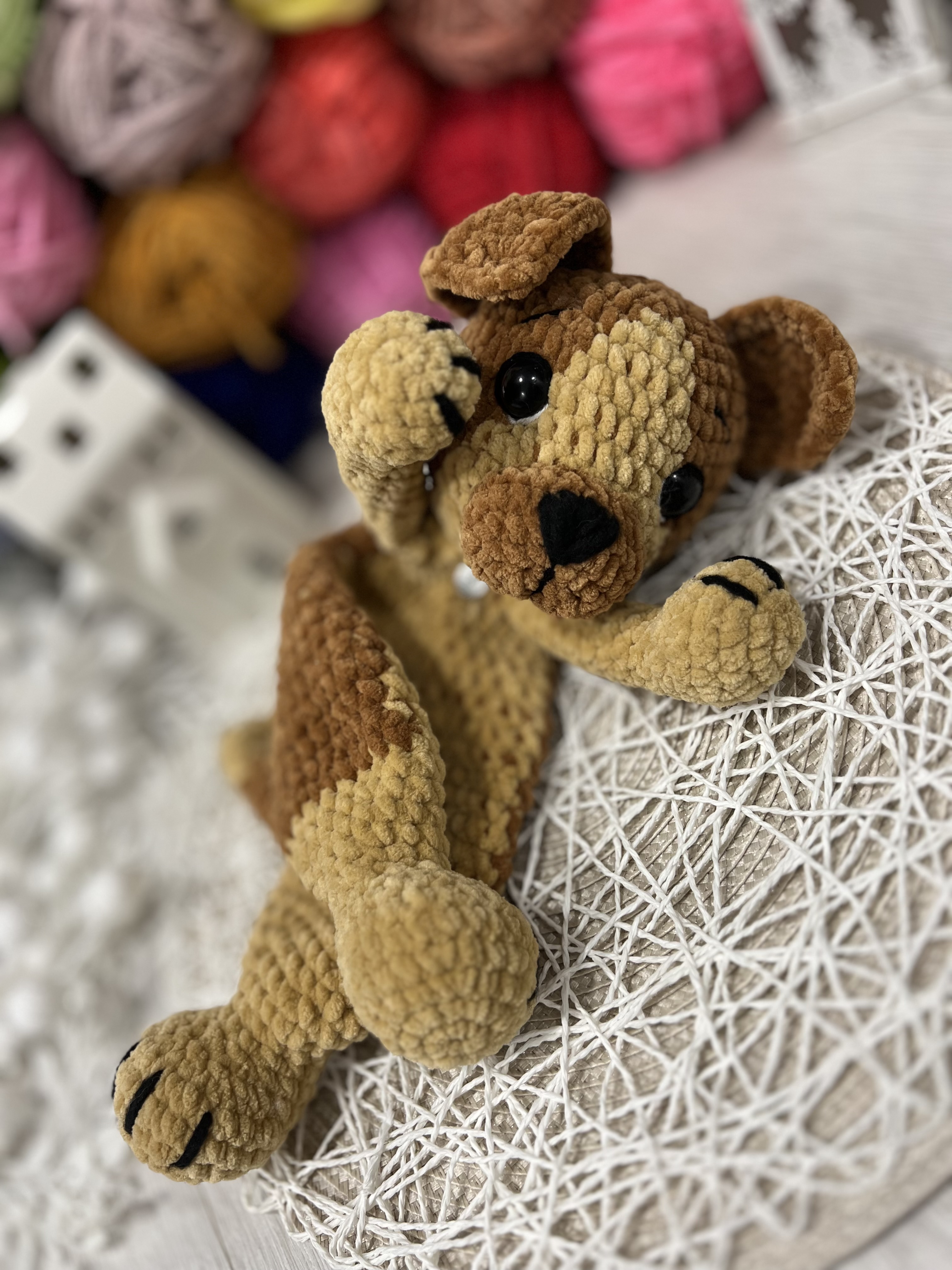 Jucarie de atasament ptr manute mici. Catel crosetat cu corp ,o jucarie handmade, realizata din fire moi de catifea , umpluta cu material hipoalergenic. Are un design adorabil, cu detalii cusute manual, ochi cu siguranta . Este o jucarie sigura pentru copii, placuta la atingere si ideala pentru imbratisari sau joaca. Perfecta pentru bebelusul tau sau pentru un cadou special !