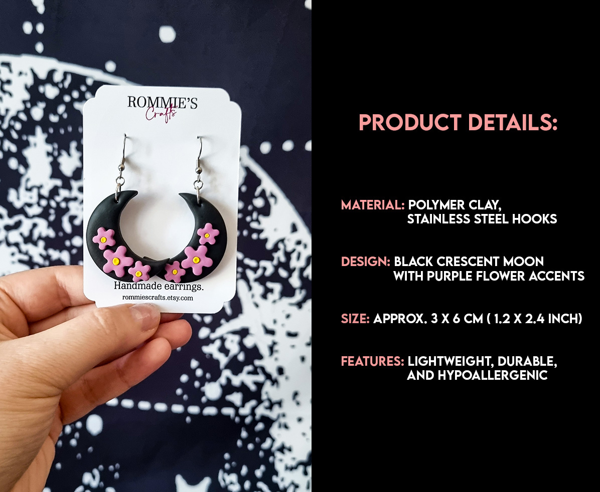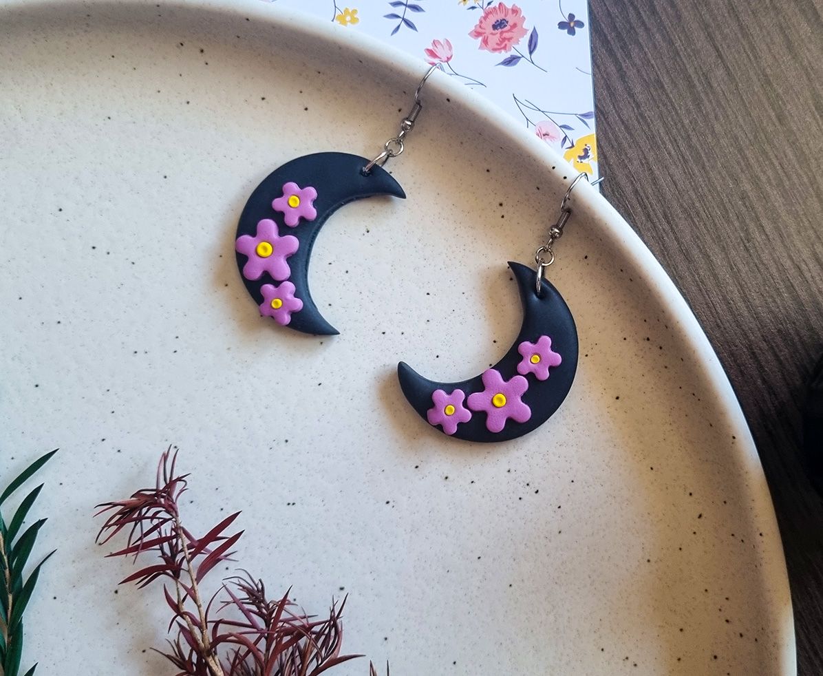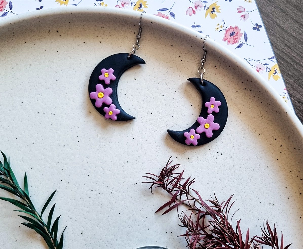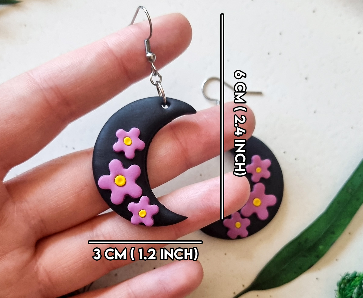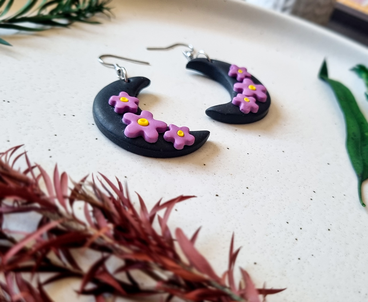 Acesti cercei handmade cu design mistic si elegant prezinta o luna neagra in forma de semiluna, decorata cu accente florale mov realizate manual. Inspirati de frumusetea noptii si a naturii, sunt un accesoriu perfect pentru orice tinuta, oferind un echilibru intre stil gotic si delicatete florala.
