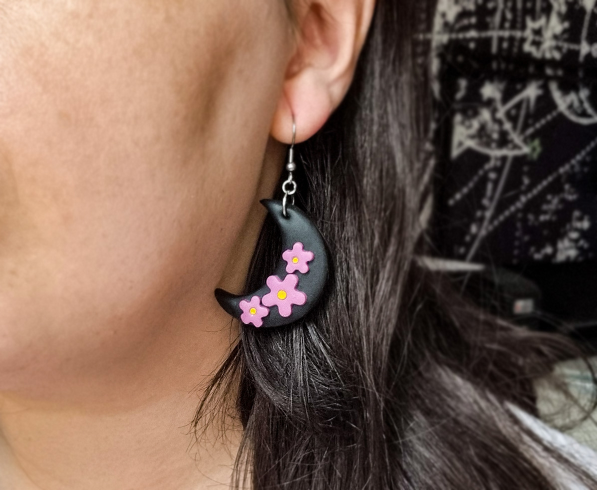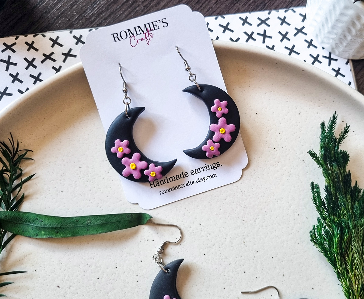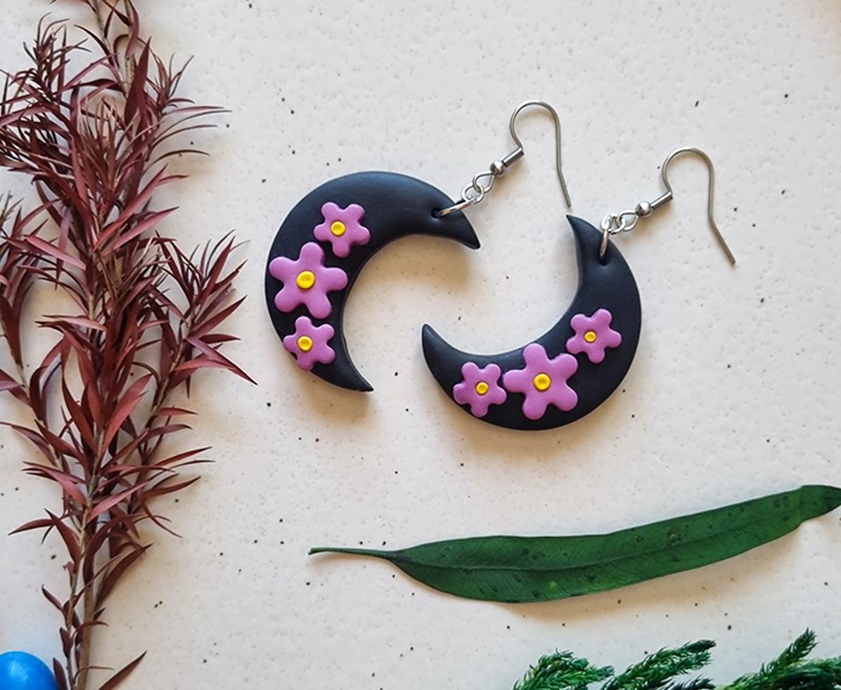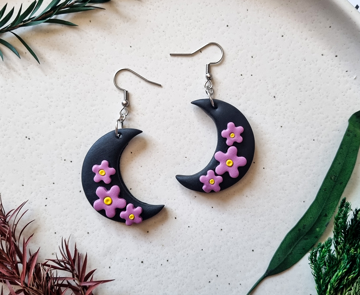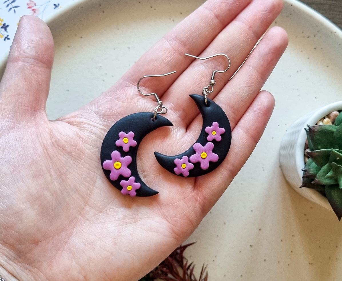 Acesti cercei handmade cu design mistic si elegant prezinta o luna neagra in forma de semiluna, decorata cu accente florale mov realizate manual. Inspirati de frumusetea noptii si a naturii, sunt un accesoriu perfect pentru orice tinuta, oferind un echilibru intre stil gotic si delicatete florala.