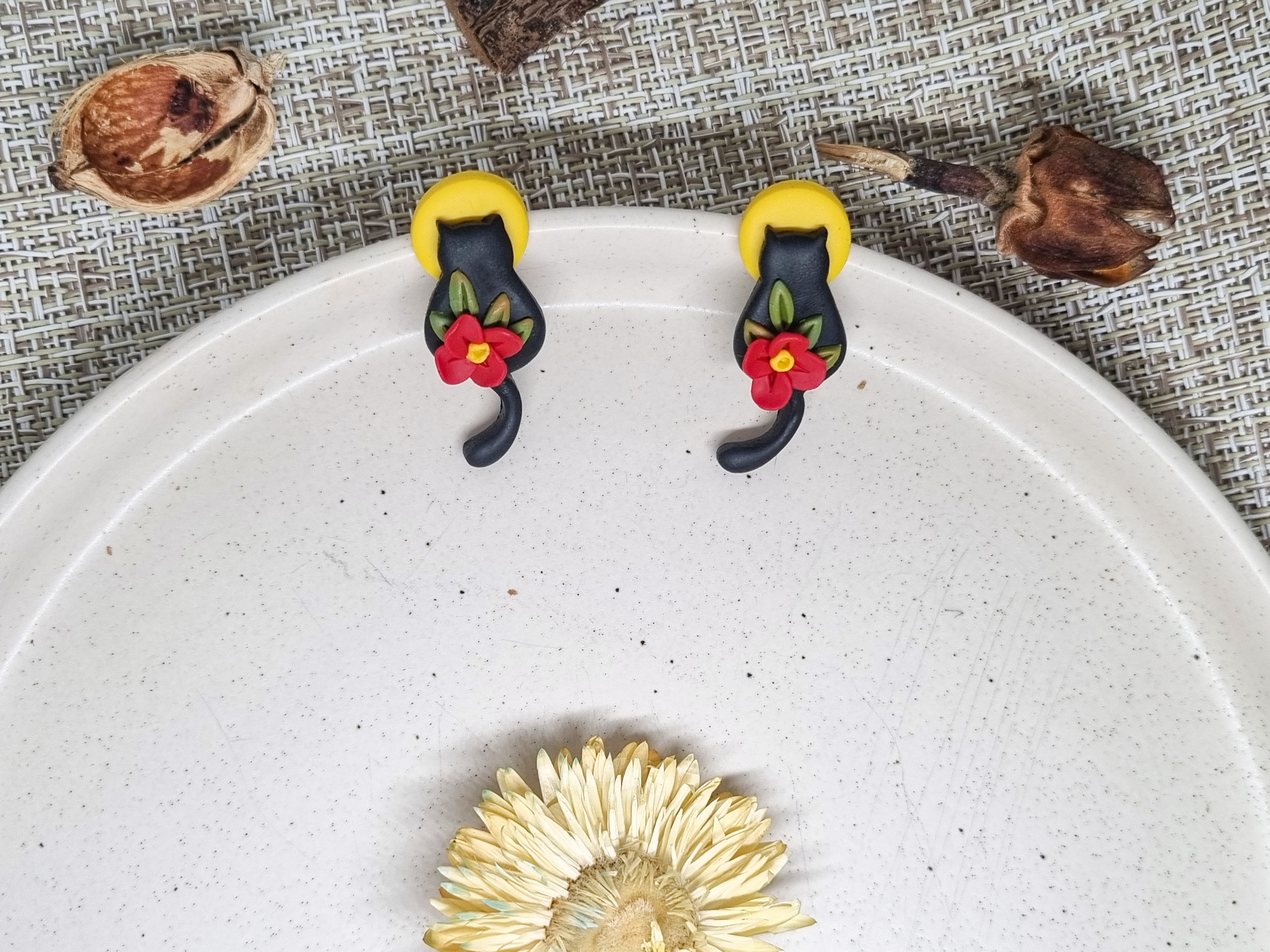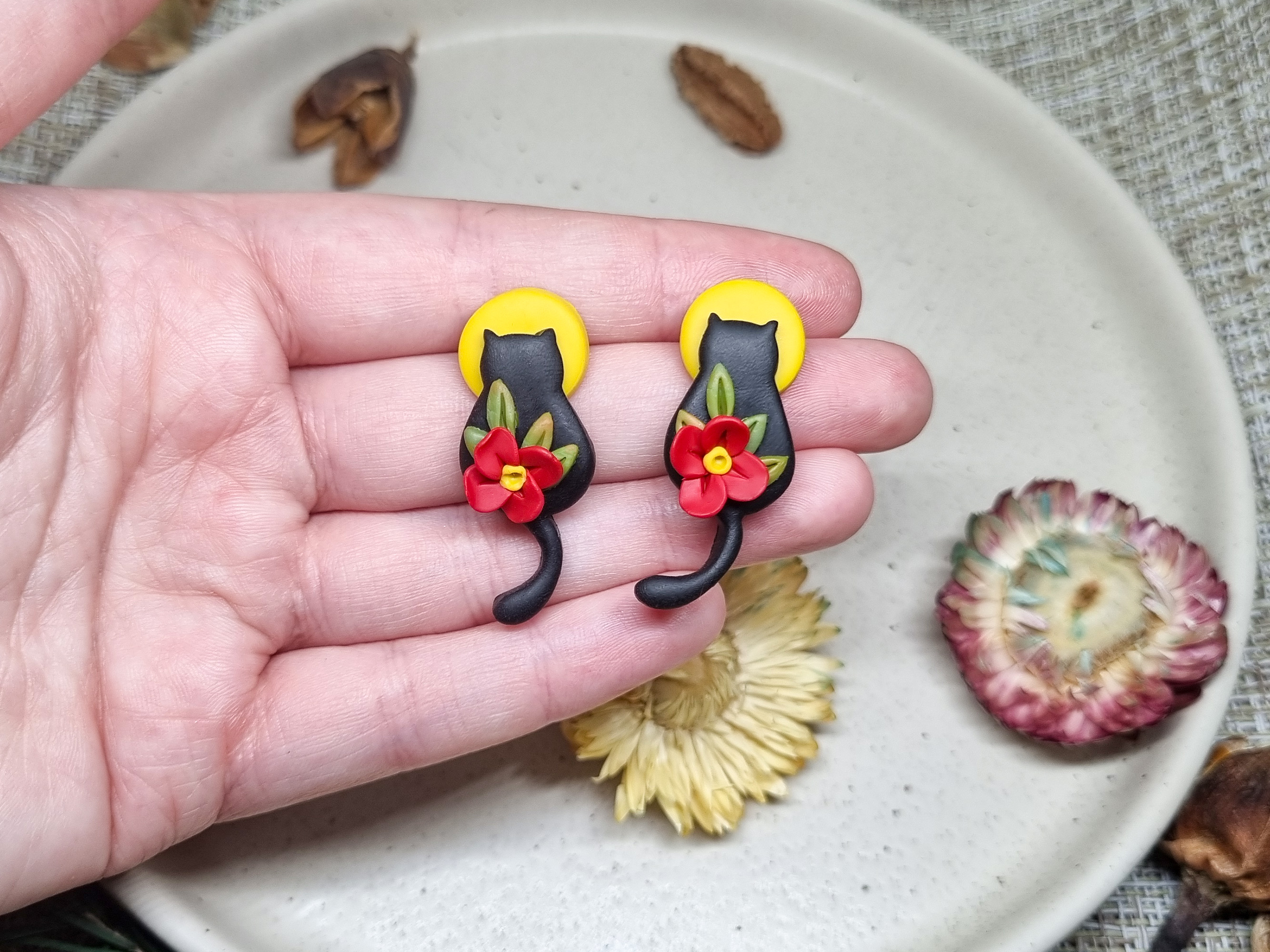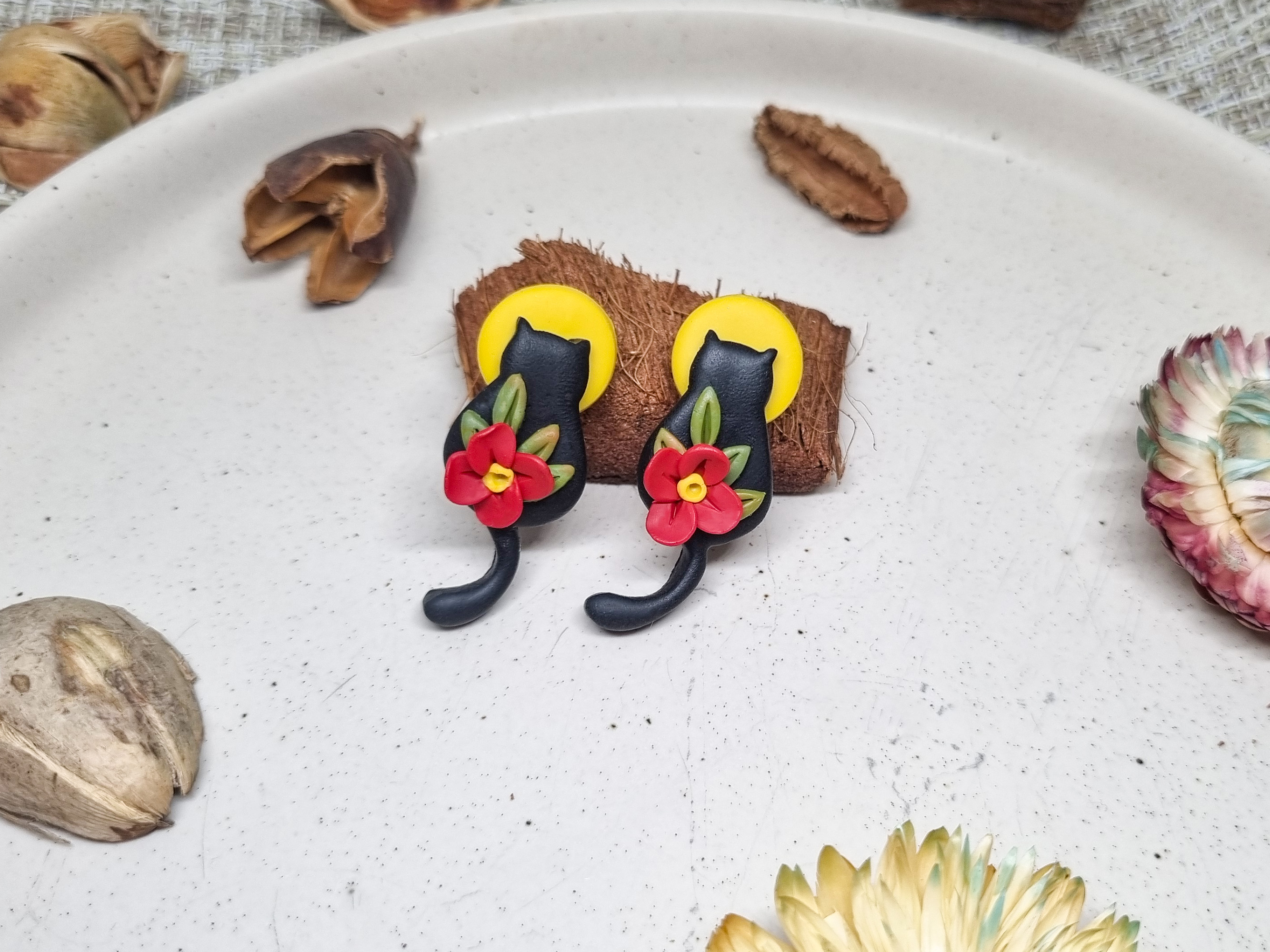 Acesti cercei handmade unici imbina eleganta si misterul intr-un design inspirat de noapte. Realizati manual din lut polimeric, cerceii prezinta siluete delicate de pisici negre asezate in fata unei luni pline aurii, decorate cu flori rosii si frunze sculptate manual.