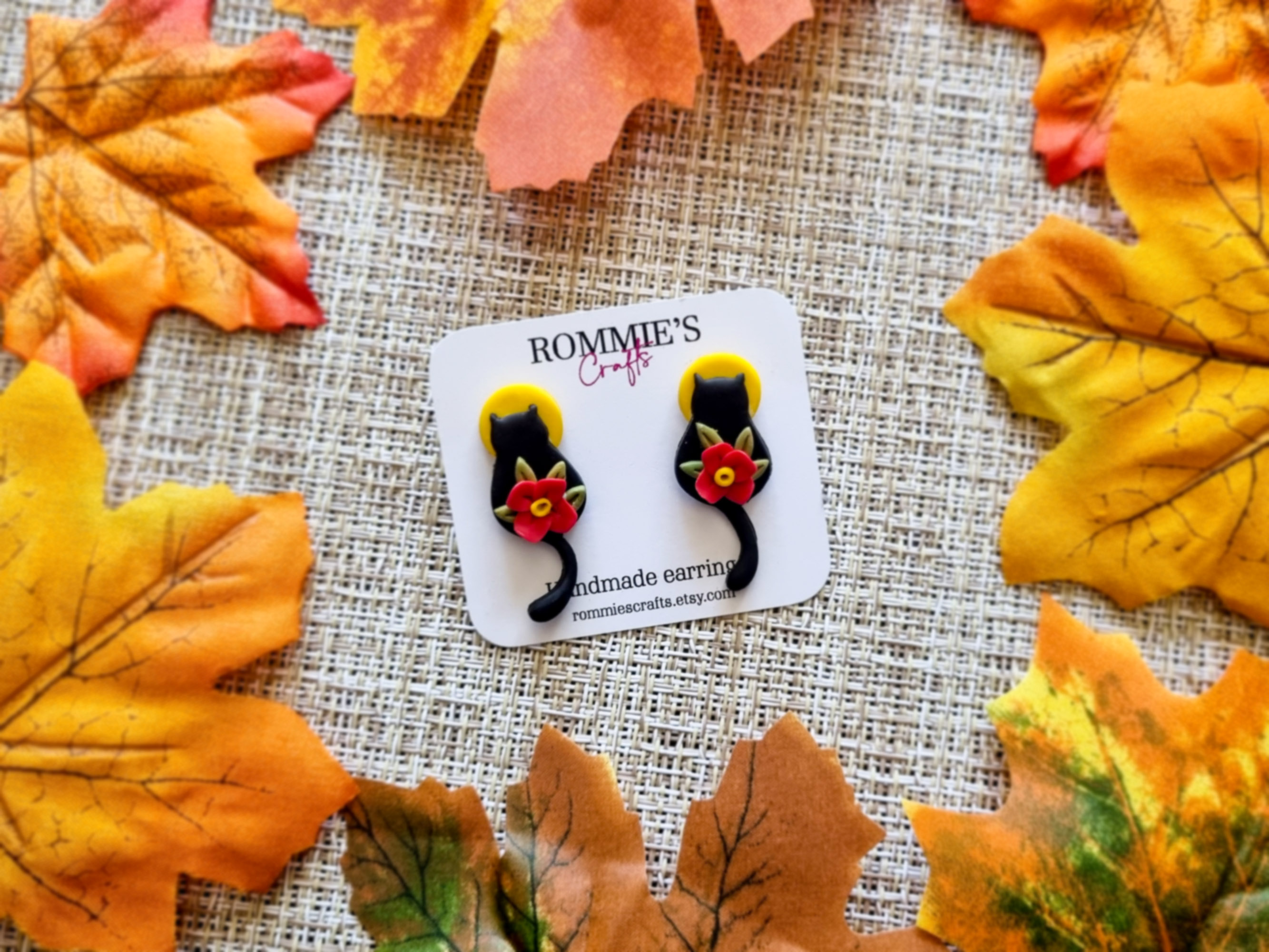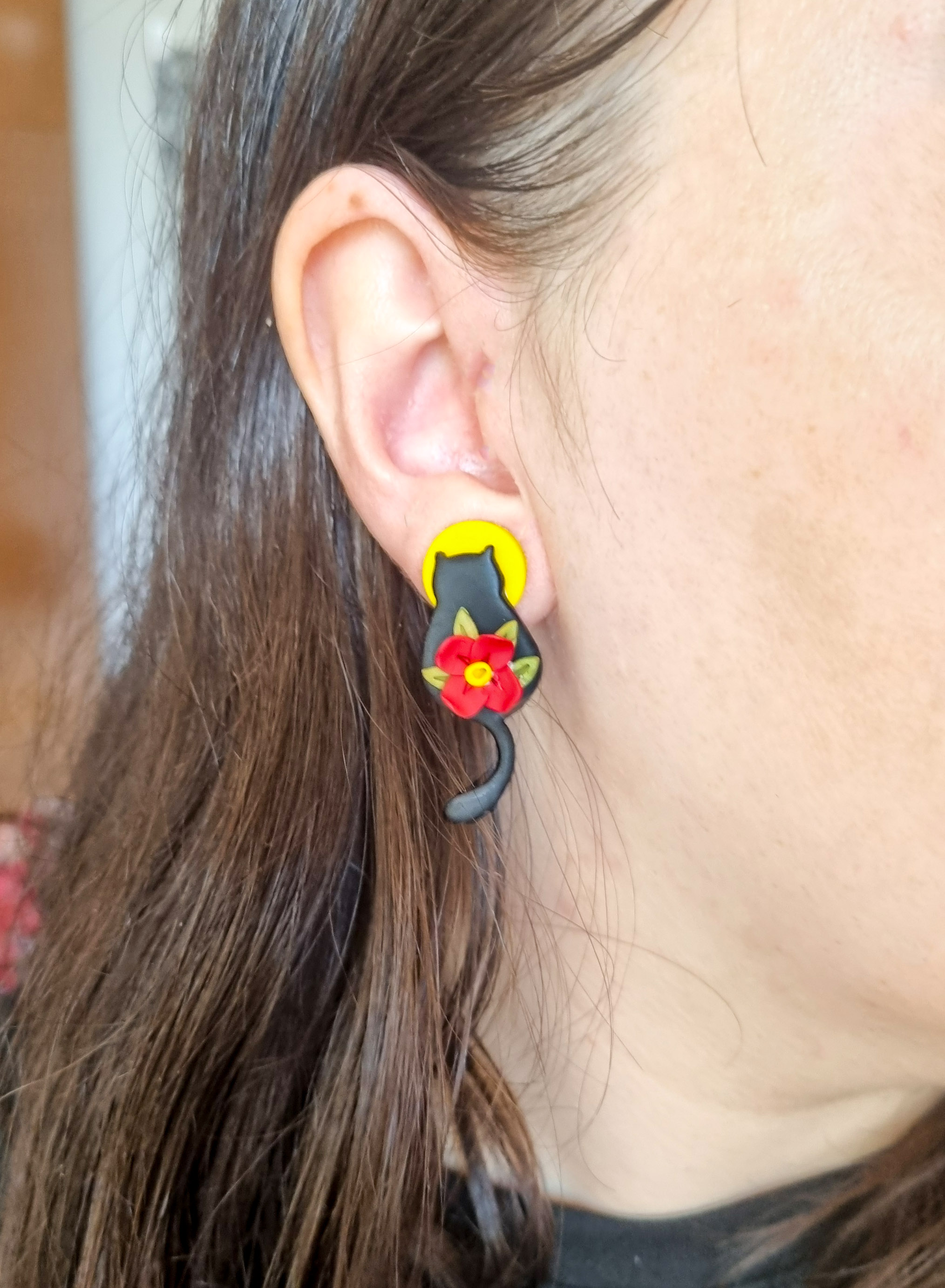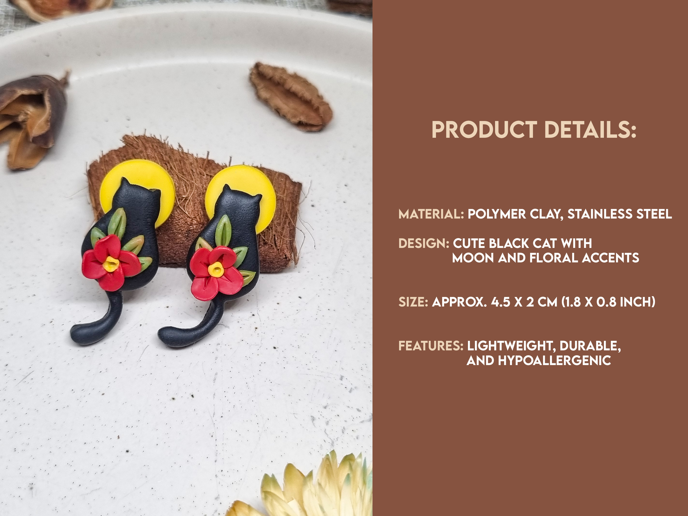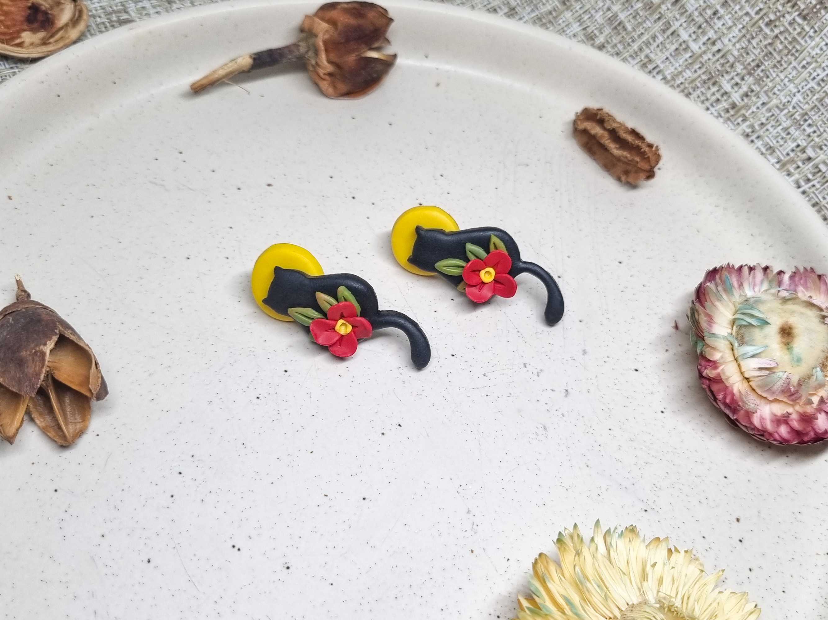 Acesti cercei handmade unici imbina eleganta si misterul intr-un design inspirat de noapte. Realizati manual din lut polimeric, cerceii prezinta siluete delicate de pisici negre asezate in fata unei luni pline aurii, decorate cu flori rosii si frunze sculptate manual.