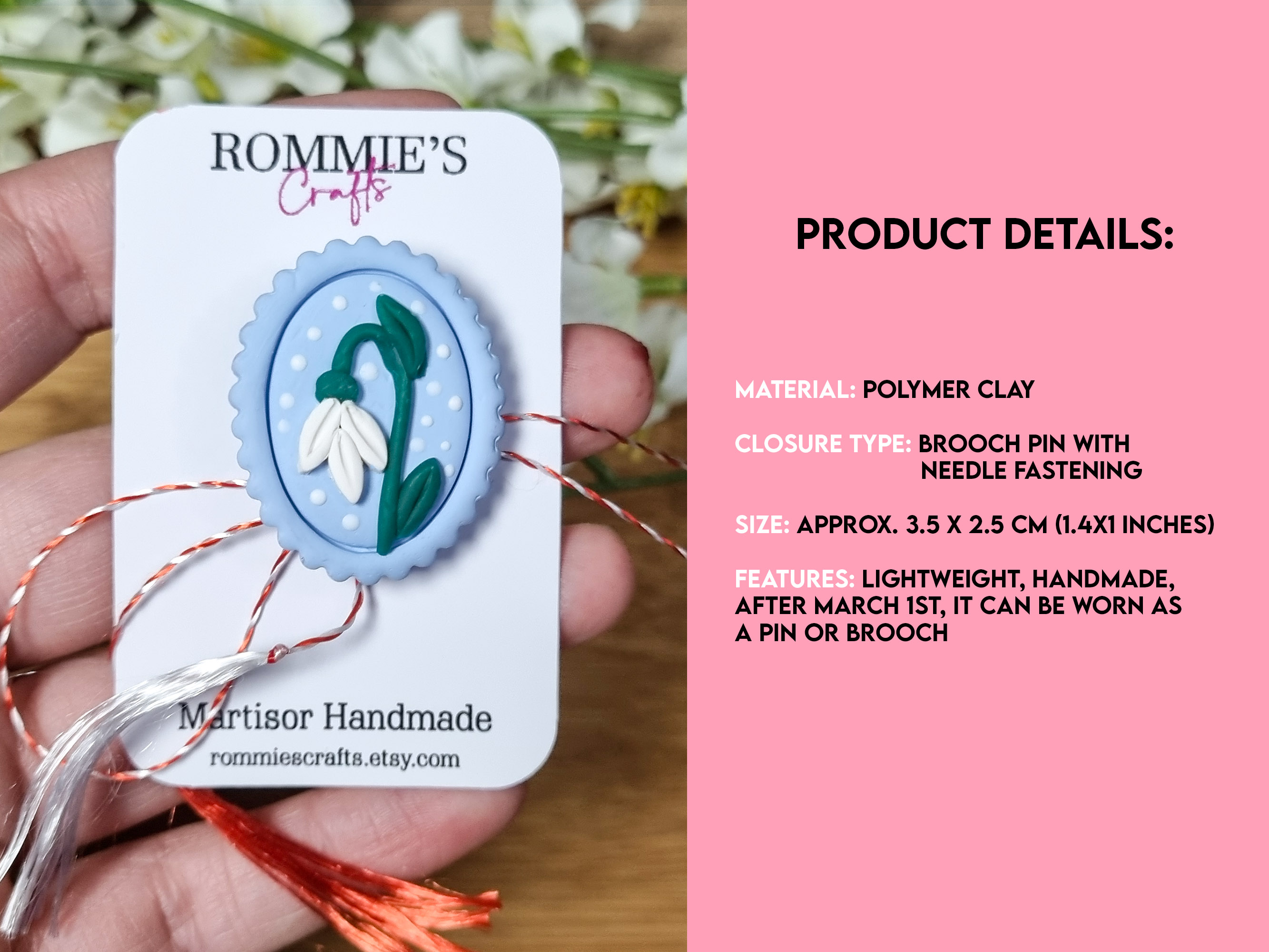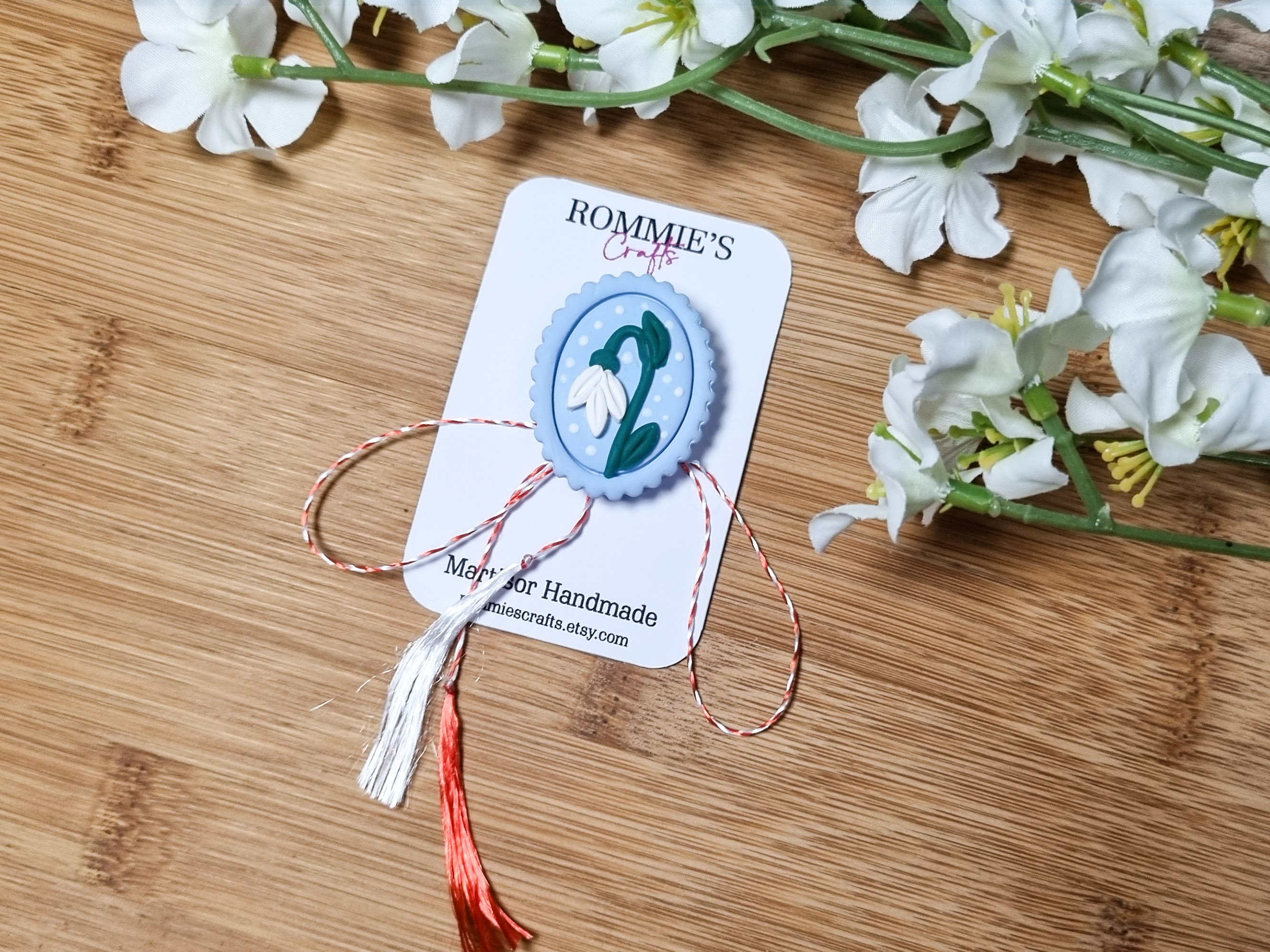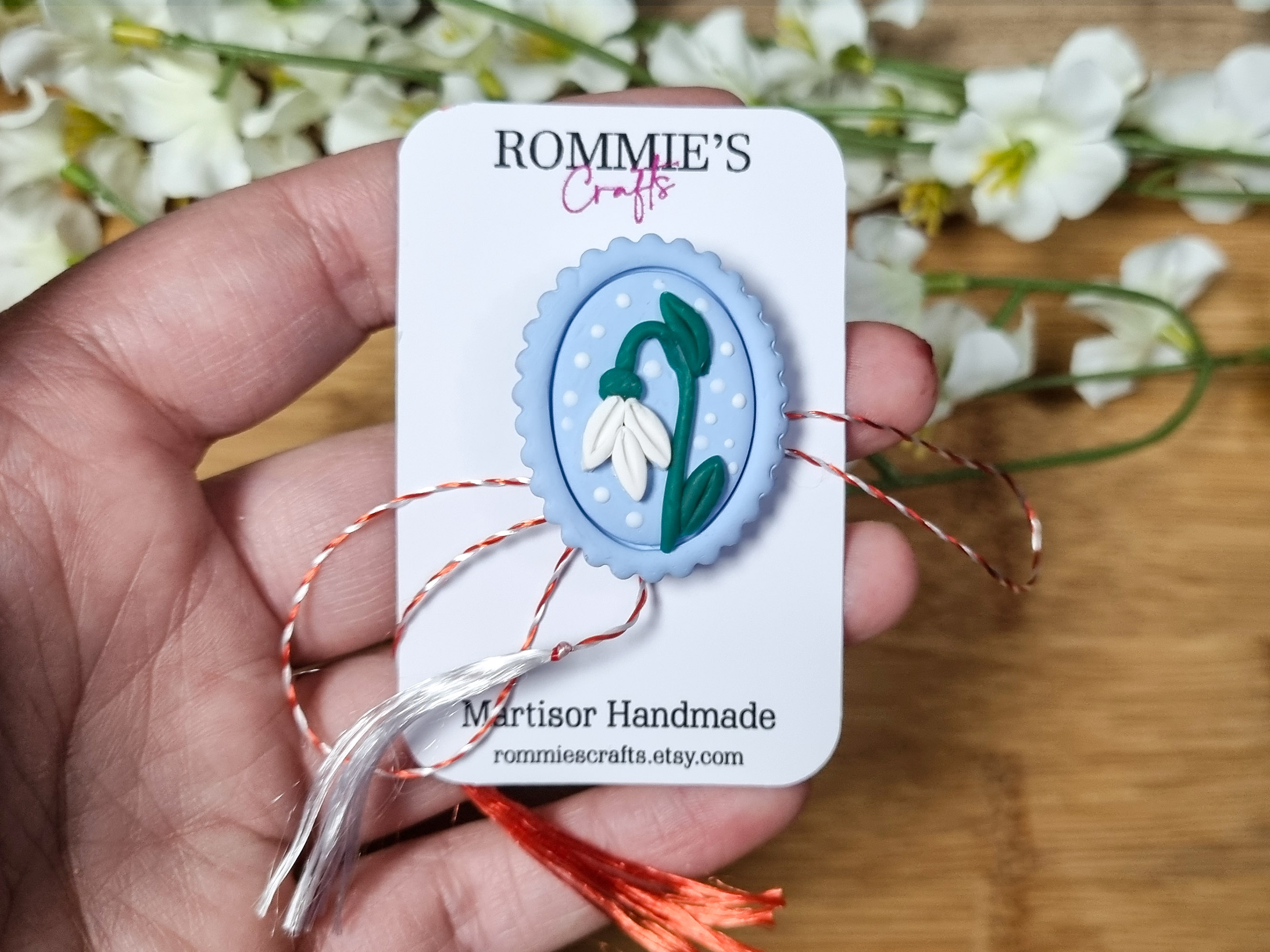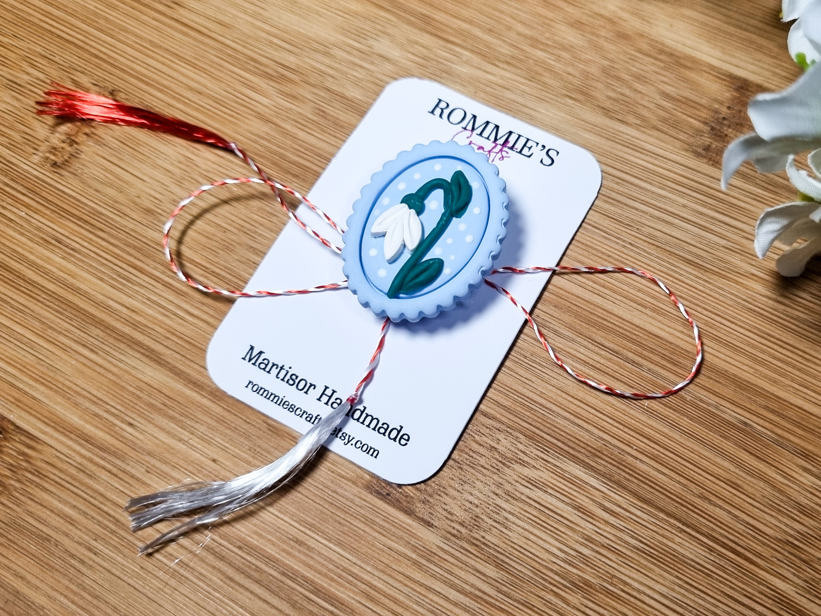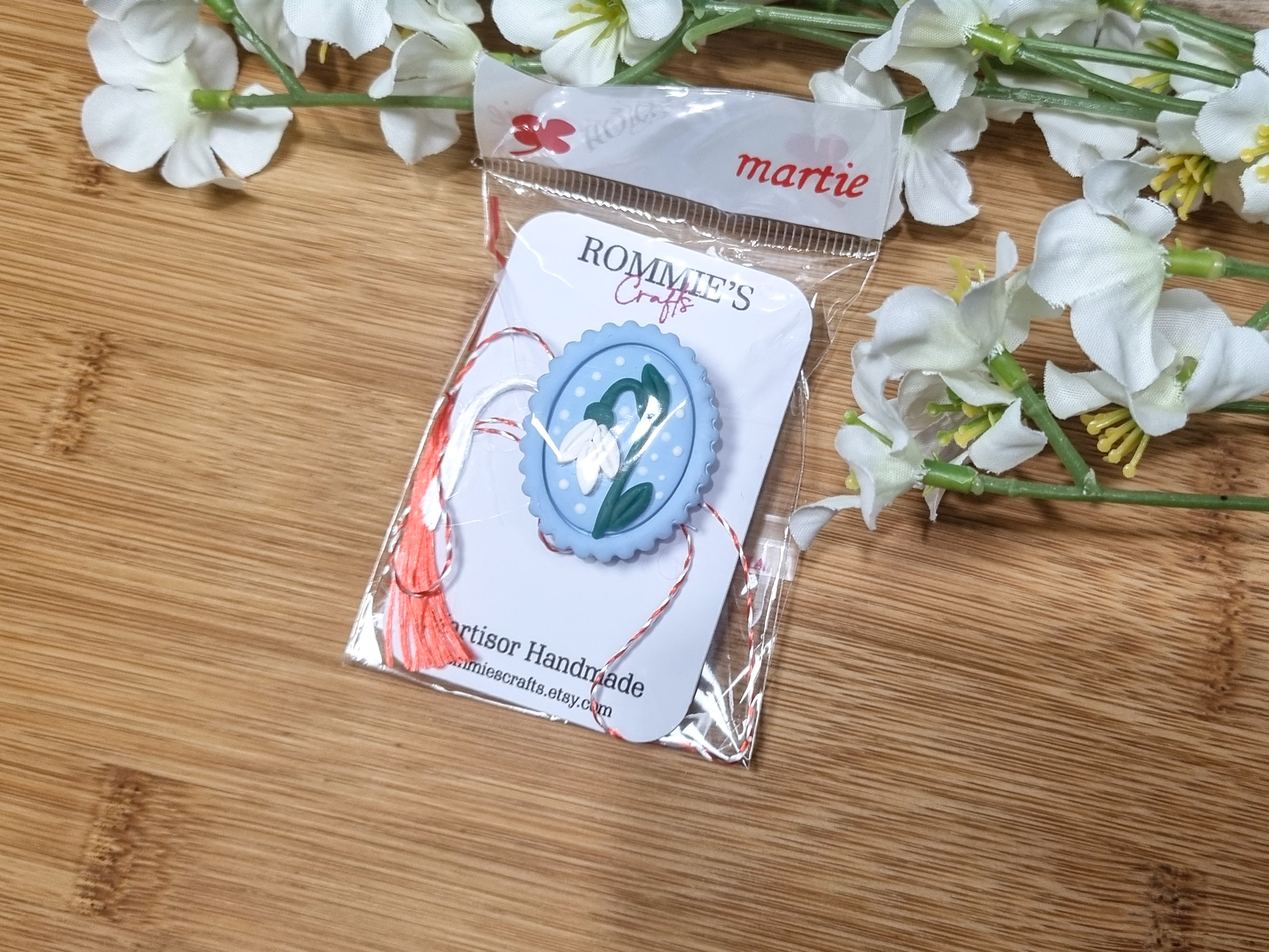 Oferă un simbol al primăverii cu acest mărțișor handmade, realizat cu migală din lut polimeric. Designul delicat al unui ghiocel alb, așezat pe un fundal albastru pastelat cu margini dantelate, aduce un aer elegant și nostalgic. Este montat pe un sistem de prindere tip ac, ceea ce îl face ușor de purtat ca broșă, chiar și după 1 Martie.