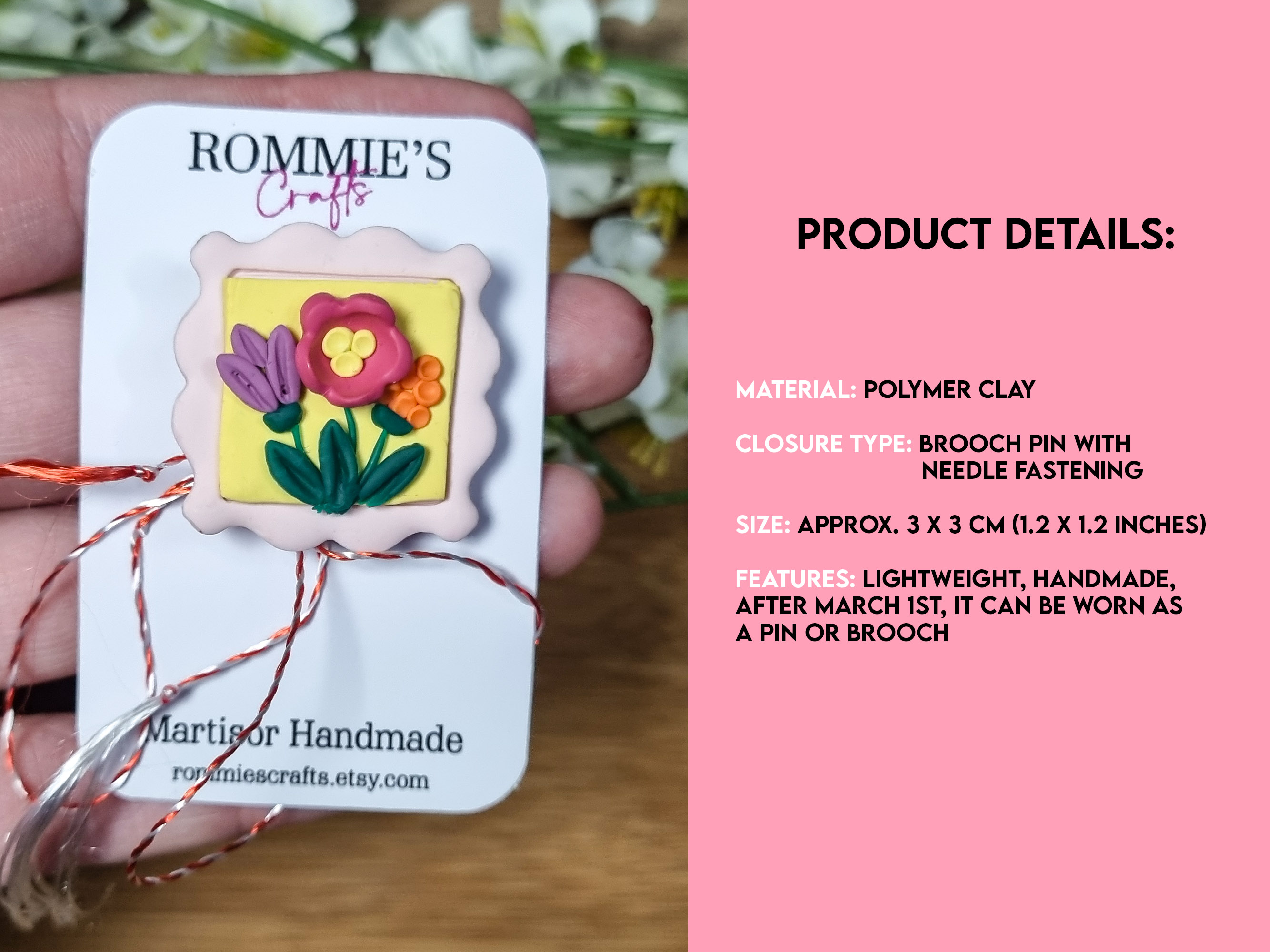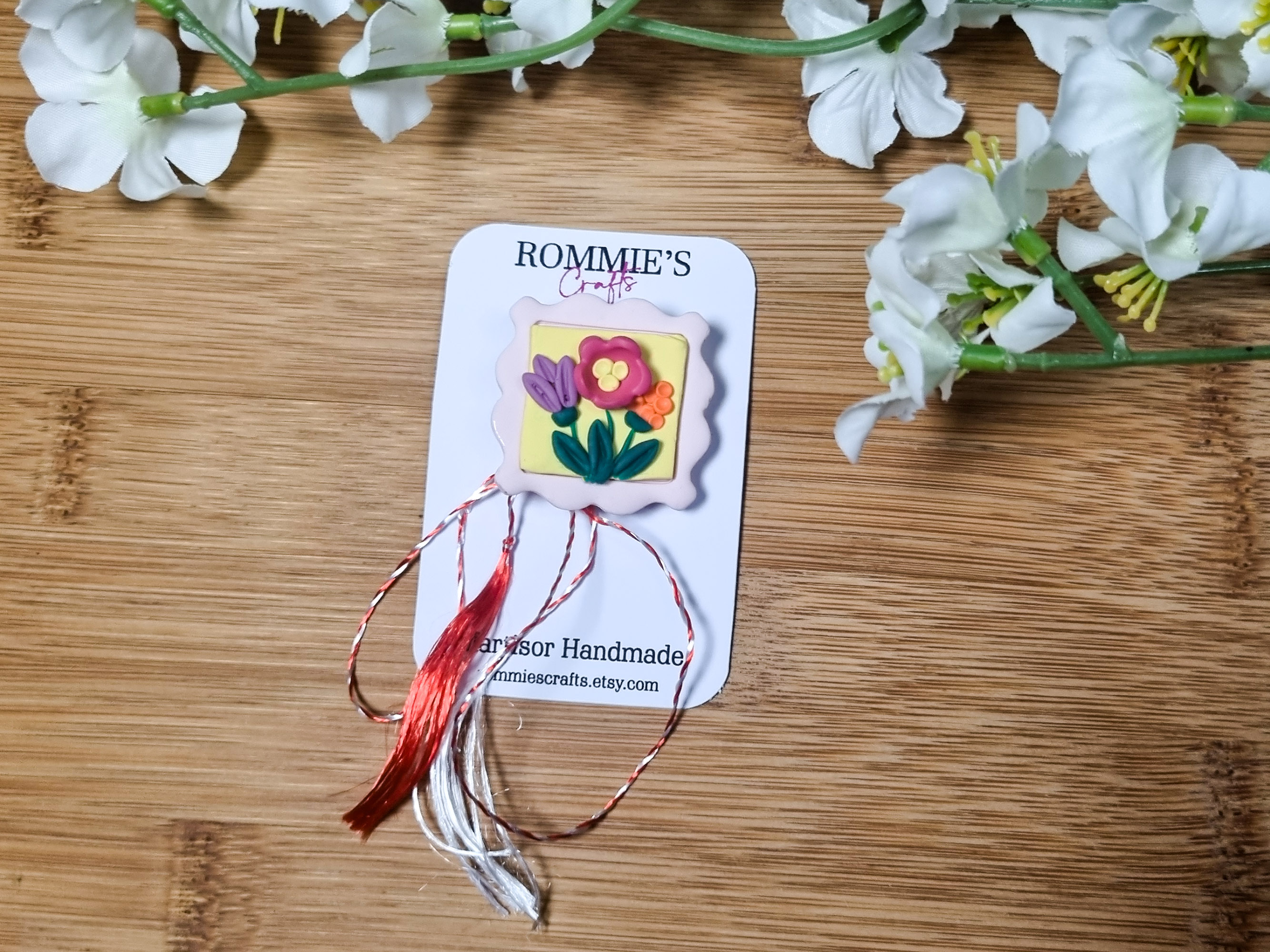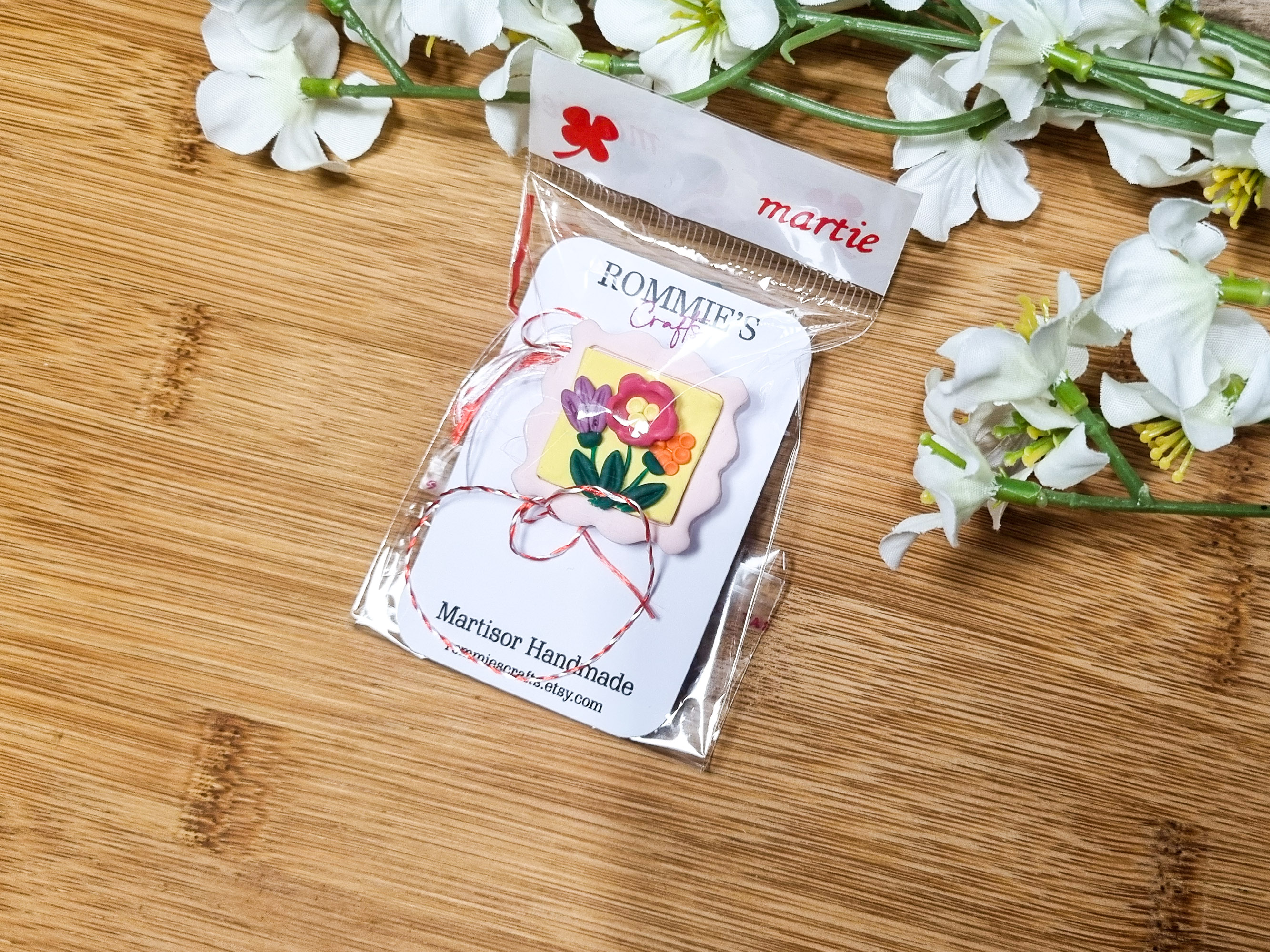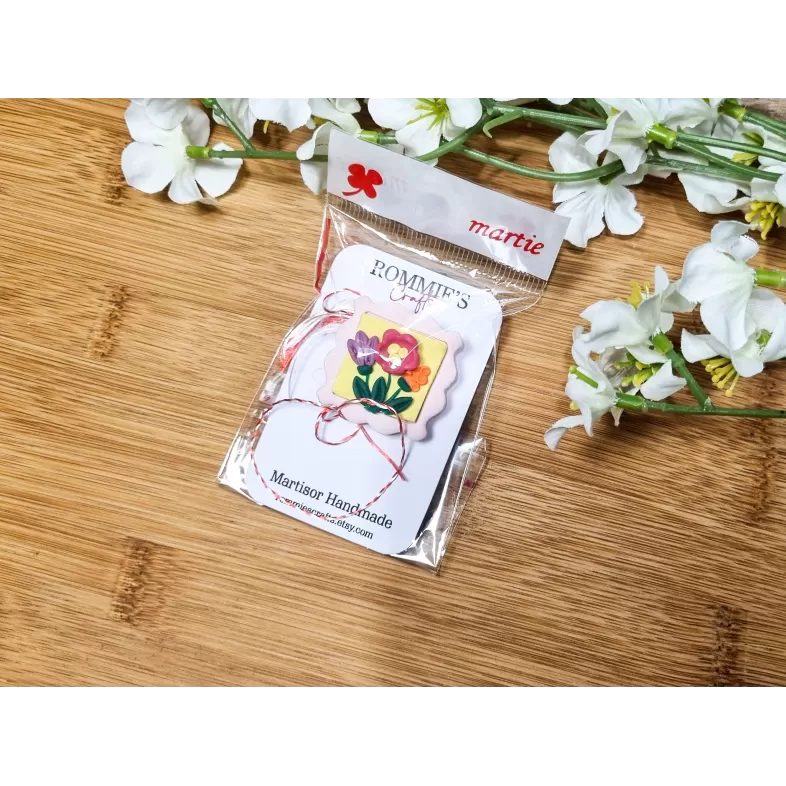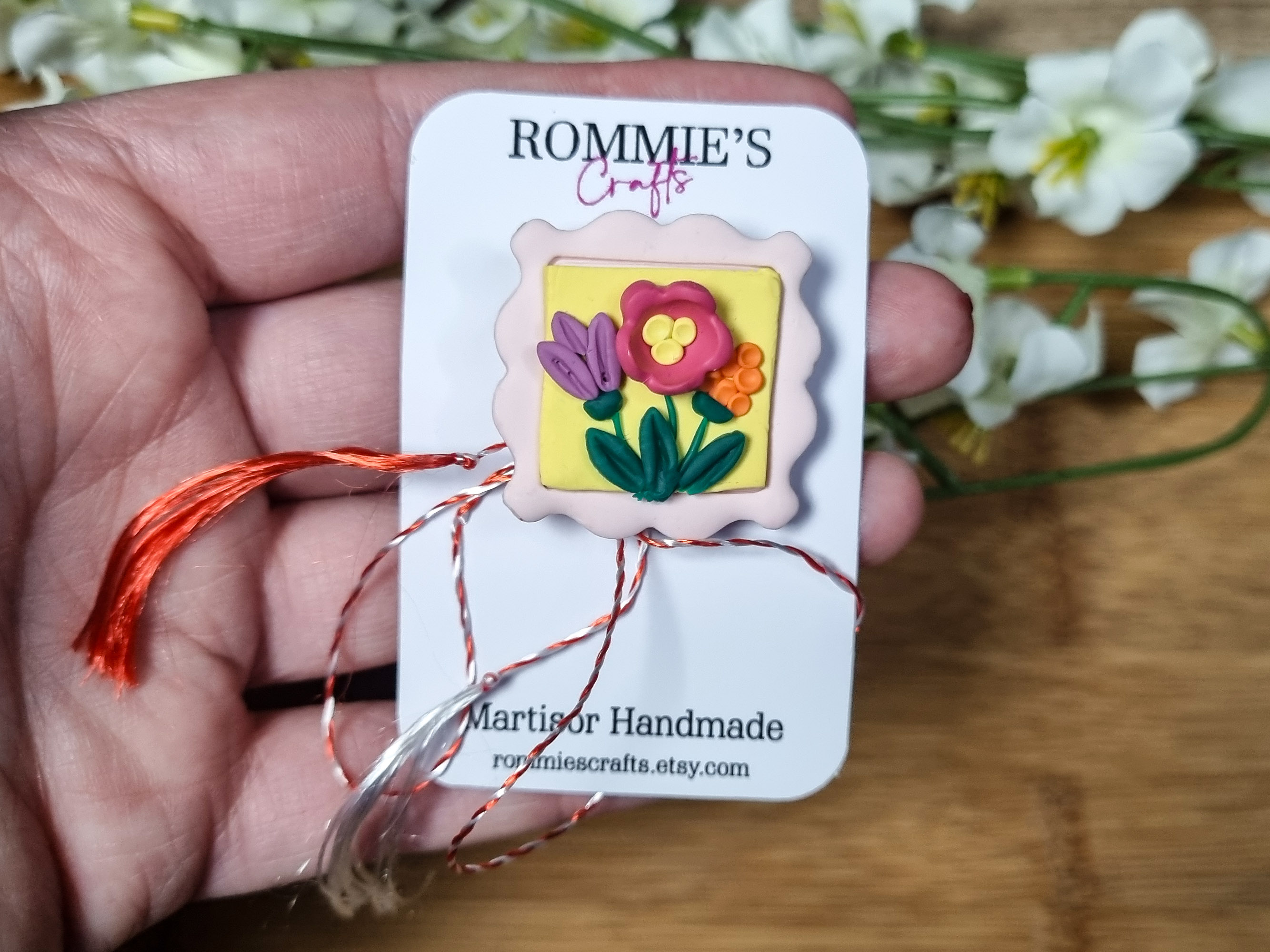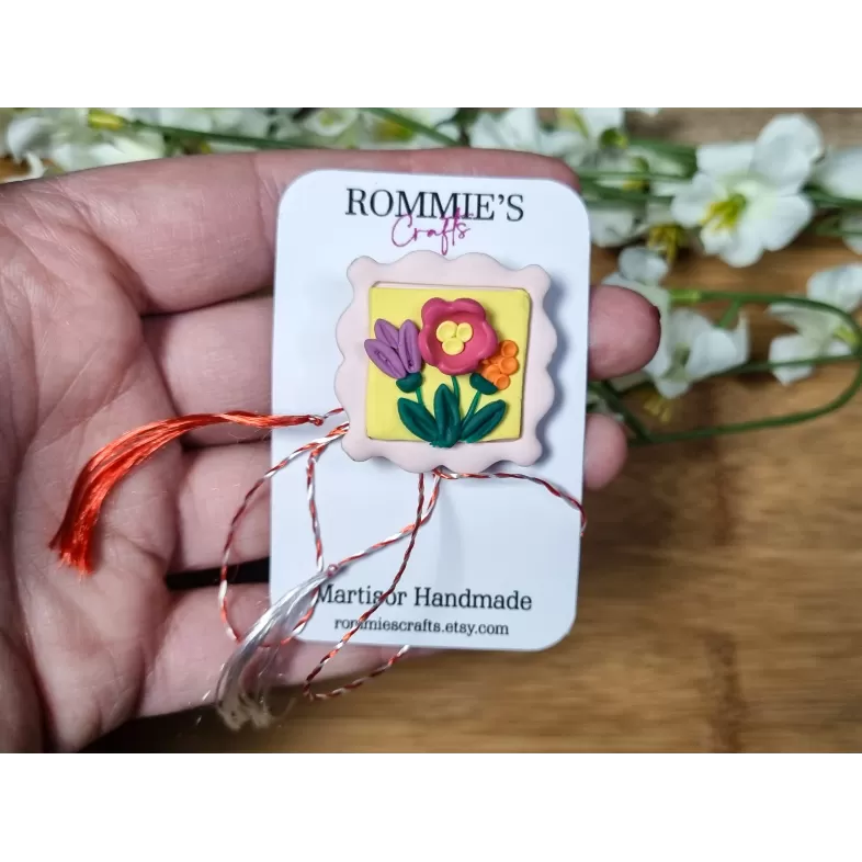 Acest martisor handmade aduce un aer vintage si elegant prin designul sau unic in forma de timbru, decorat cu un buchet de flori modelat manual. Realizat din lut polimeric si avand margini dantelate, acest model este inspirat de farmecul scrisorilor si al primaverii inflorite.
