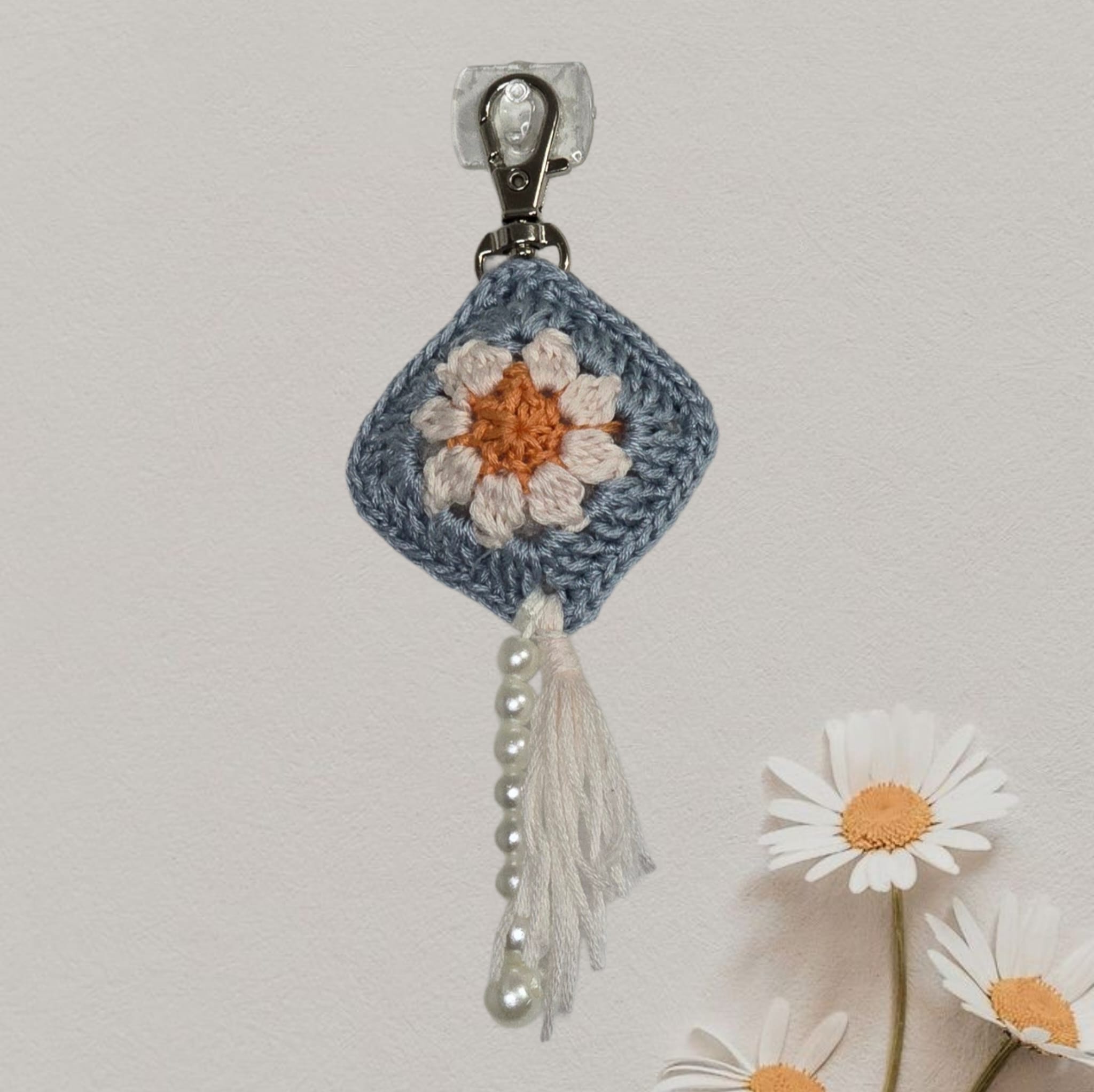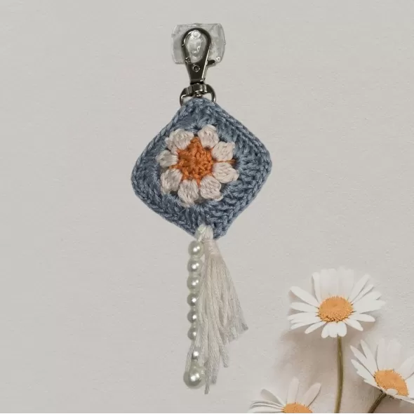Breloc crosetat cu tehnica granny square (patratul bunicii) cu accesorii din ata, panglica si margele.