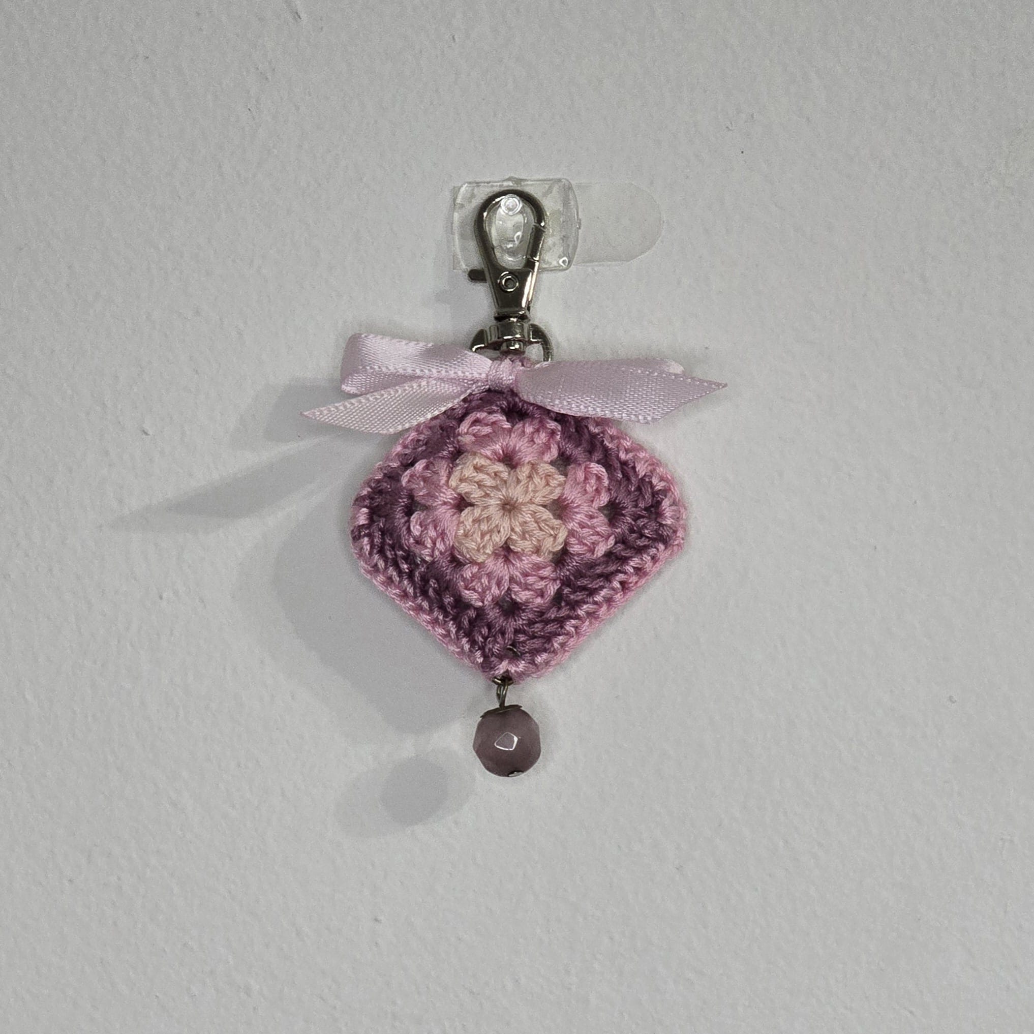 Breloc crosetat cu tehnica granny square (patratul bunicii) cu accesorii din ata, panglica si margele.