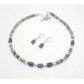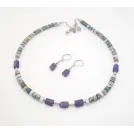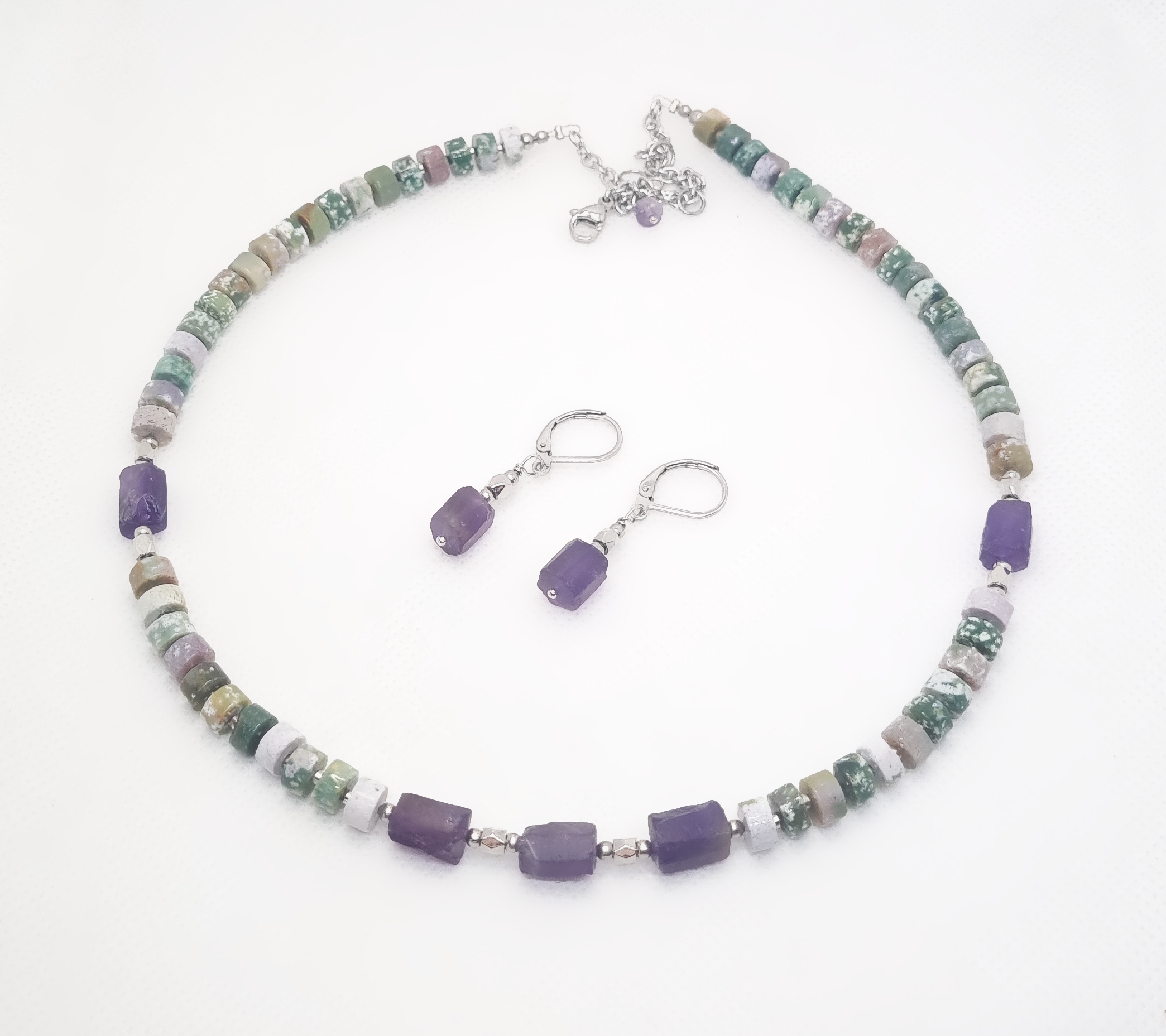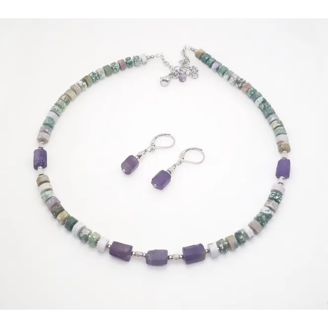 Set compus din colier si cercei, realizati cu pietre de agat indian si ametist. Lungimea colierului este reglabila (intre 43cm si 48.5cm), iar cea a cerceilor de 3.3cm). Produs unicat.