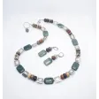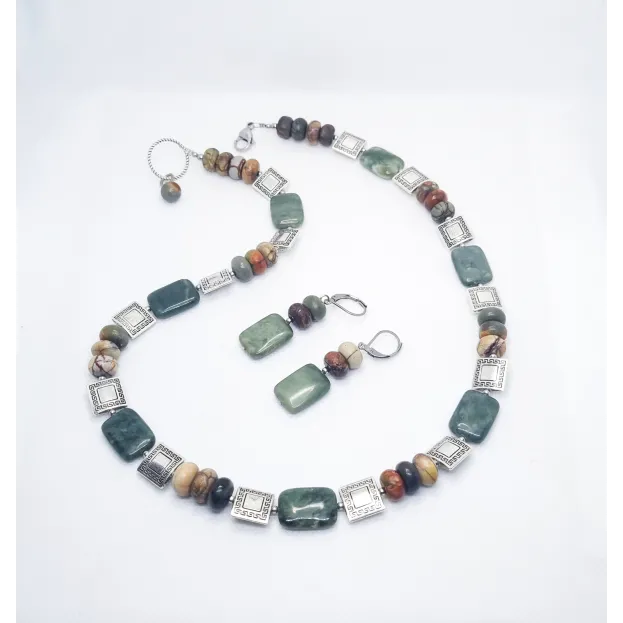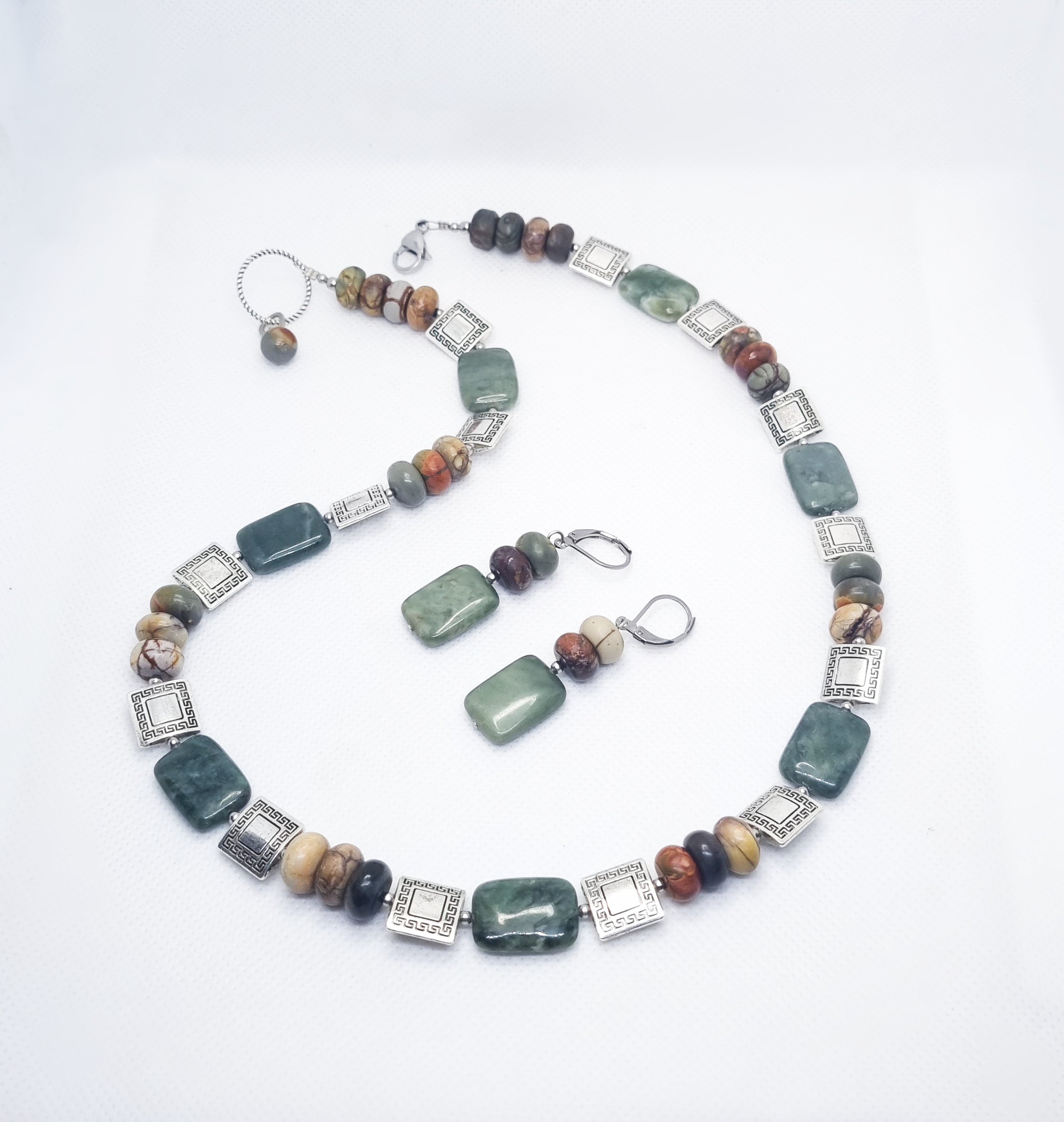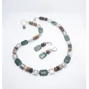 Set compus din colier si cercei, realizat cu pietre de jasp Picasso si nefrit. Lungimea colierului este de 54cm, iar cea a cerceilor de 5cm. Produs unicat.