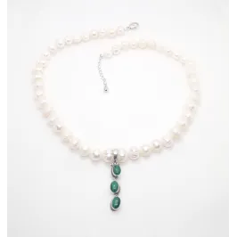 Colier realizat cu perle de cultura albe si pandantiv de malachit natural, lucrat cu noduri din fir de mătase. Lungimea colierului este reglabil (intre 40cm si 44cm). Produs unicat. Dimensiuni: Perle - 8-9mm. Pandantiv malachit - 38/7/4mm. Materiale: Argint 925, fir de mătase.