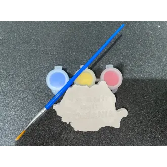 Set magnetic harta Romaniei contine un set de 3 culori acrilice, 1 pensula si 1 bucata magnet din ipsos cu harta României.
