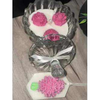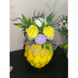 Produs unicat, făcut manual. Vază decorativă pictată manual, cu flori de săpun și verdeață decorativă. Nu miroase puternic, are un parfum subtil și plăcut. Potrivită pentru cadou sau decor interior (birou, living, hol). Vaza este pictată manual (culoare galben pastel) Flori de săpun (nu se ofilesc, aspect fresh) Verdeață decorativă Produs unicat — nu există două identice