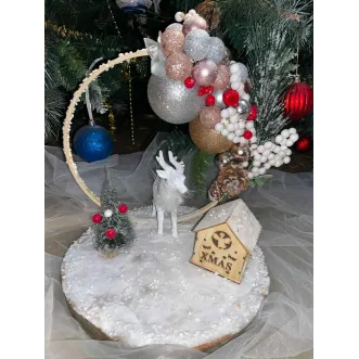 Decor de Crăciun „XMAS Magic” – realizat manual Adu magia sărbătorilor în casa ta cu acest decor unic, realizat manual de TwinArt. Pe o bază acoperită cu zăpadă artificială se așază cu delicatețe un brăduț miniatural, un ren alb elegant și o căsuță luminoasă inscripționată XMAS, care oferă un efect spectaculos pe timp de seară. Aranjamentul este completat de un cerc decorativ cu globuri strălucitoare, conuri naturale și accente roșii de sezon, simbolizând armonia și bucuria Crăciunului. Dimensiuni aproximative: 25 × 25 cm Materiale: lemn, zăpadă artificială, globuri, decorațiuni florale și textile Detaliu special:...