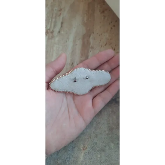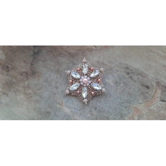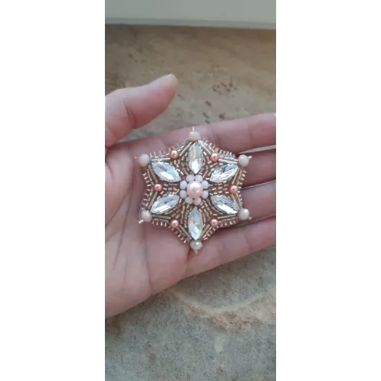 Broșă "Nordic Star" – Stea de cristal cu perlă centrală și mărgele fine Strălucește ca cea mai frumoasă stea de pe cer! Inspirată de eleganța fulgilor de zăpadă și de lumina astrelor, broșa Nordic Star este o piesă sofisticată, realizată integral prin coaserea manuală a elementelor de cristal și a perlelor de diferite dimensiuni. Este accesoriul care aduce un strop de magie și noblețe oricărei garderobe. Detalii de execuție și rafinament: Centru delicat: Piesa centrală este o perlă roz pal, de o finețe rară, înconjurată de mărgele sferice care îi subliniază forma perfectă. Reflexii de cristal: Am dispus cristale alungite în formă de...