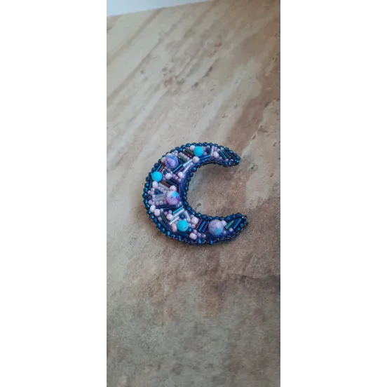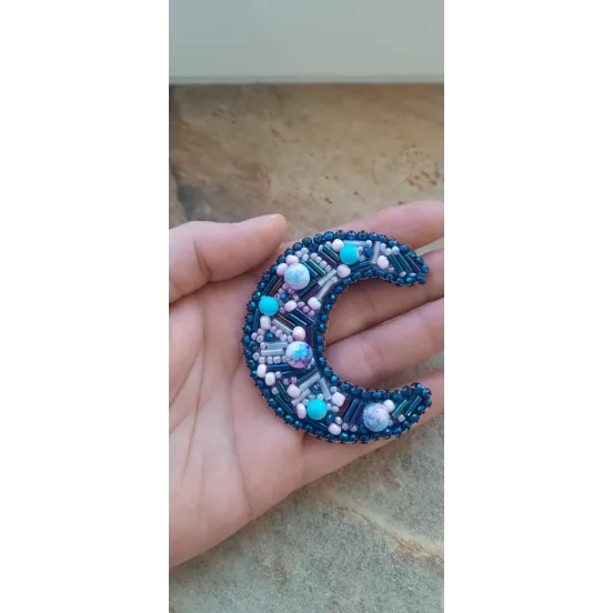 Broșă "Blue Moon" – Semilună Brodată Manual cu Mărgele și Cristale Poartă cu tine magia nopții înstelate! Broșa Blue Moon este o piesă artizanală deosebită, creată prin tehnica broderiei pe suport textil. Această semilună nu este doar un accesoriu, ci o mică poveste nocturnă cusută cu infinită răbdare, perfectă pentru a adăuga un strop de mister și eleganță oricărei ținute. Detalii care o fac specială: Mozaic de mărgele: Am împletit manual mărgele de diverse texturi și dimensiuni—de la mărgele tubulare cu reflexii metalice, până la perle sferice în nuanțe de roz pal și albastru turcoaz. Accente de culoare: Mixul vibrant de...